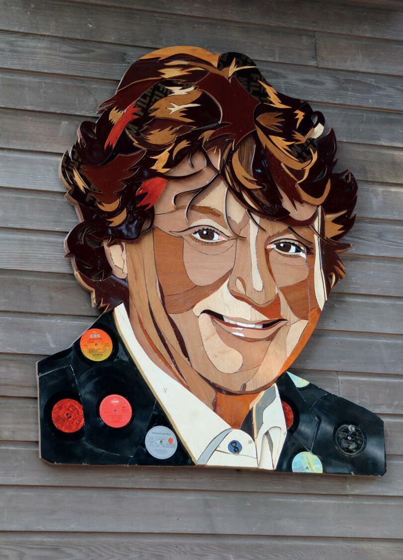 kunstzinnige beeltenis, onder toeziend oog van een groep en een schare fans. Onder luid applaus kwam de beeltenis tevoorschijn vanachter een stuk van het theaterdoek van de Kentering dat Albert zo vaak ook voor hem op zag gaan. Hoog aan een muur bij het Rosmalen se partycentrum waar Albert West zijn debuut maakte is een prachtig portret te zien gemaakt uit oud hout van over de hele wereld maar ook met ingrediënten die direct aan Albert te linken zijn. Zo verwerkte kunstenaar Diederick Kraaije veld, die eerder ook houten portretten maakte koningin Beatrix en Barack Obama, onder meer zijn biljartkeu, tafeltennisbatje en kleerhanger en ook het scorebord van zijn vriendenbiljart club de Kikkers in het prachtige werk. Uitzon derlijk is dat Kraaijeveld voor het eerste niet alleen hout gebruikte, het zwart van het jasje werd gerealiseerd met lp’s van Albert. Kleinkin deren Femke (18), Nienke (16) en Liselotte (12) onthulden vlak bij het kunstwerk een plaatje met een QR-code die verwijst naar een website met achtergrondinformatie over Albert West en het kunstwerk. Een naamsvermelding ontbreekt bij het kunstwerk. Maar de vriendengroep heeft al een straatnaambordje laten maken om het plein bij de Kentering om te dopen tot Albert Westplein. Rosmalen hoopt van harte dat de gemeente meewerkt dit officieel te maken en zo de betekenis van de zanger en zijn band voor Rosmalen én de emancipatie van Brabant recht doet.