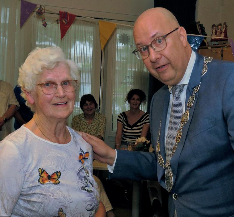 Geertje van Huisstede, medewerker Welzijn & dagbesteding bij Hof van Hintham, werkt al jarenlang fijn samen met Diny en is de grote initiator achter het lintje. “Als ik hoorde wat ze allemaal wel niet deed, dacht ik altijd: Diny verdient echt een onderscheiding. Maar wie draagt haar voor, bedacht ik me er dan bij? Uiteindelijk besloot ik het zelf te doen. Simpelweg omdat ze het écht verdient.” Met militaire precisie werd - zonder dat Diny er ook maar íets van wist - een prachtige receptie georganiseerd. “Met een smoes werd ik een halfuur weggelokt en toen was in no-time de hele ruimte versierd. Ik dacht in eerste instantie dat mijn hersenen het even niet meer deden, toen ik weer naar binnen liep. Ballonnen, slin gers en allemaal mensen die een belangrijke rol in mijn leven hebben gespeeld. Toen ik nog eens goed keek, bleek het toch echt waar te zijn. Ik kon mijn ogen niet geloven”, geniet Diny hoorbaar nog na van de middag die ze nooit meer vergeet. Drie kwartier later voegde burgemeester Mikkers zich bij het feestelijke gezelschap en was de schrik helemáál compleet. “Het is een film, ik kan het nog steeds bijna niet bevatten wat er is gebeurd.”
