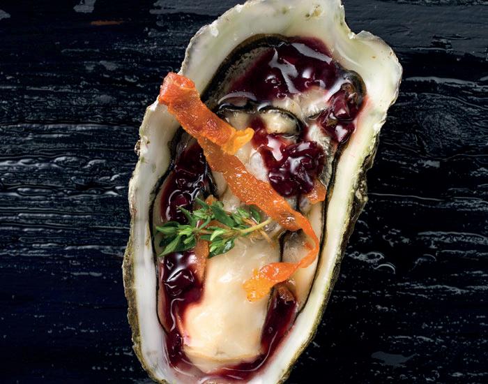 Open de oesters en snijd ze los. Schenk een beetje vocht uit elke oester en serveer met wat warme rodewijnsaus, hamreepjes en een takje tijm.