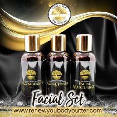 Renew You Body Butters 3 step facial set is what your skin is looking for. If you got acne, dark marks, eczema, rosacea, crows feet or hyperpigmentation this is the facial set you need. All natural and organic ingredients. No artificial colors or fragrances in our skincare products. Quality ingredients for quality results.