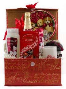 Red Verbena Christmas Basket Includes luxurious body care products, towel and loofah, large pillar candle, gourmet chocolate, holiday cookie tin, bottle of cider and wine goblets in a decorative hat box!