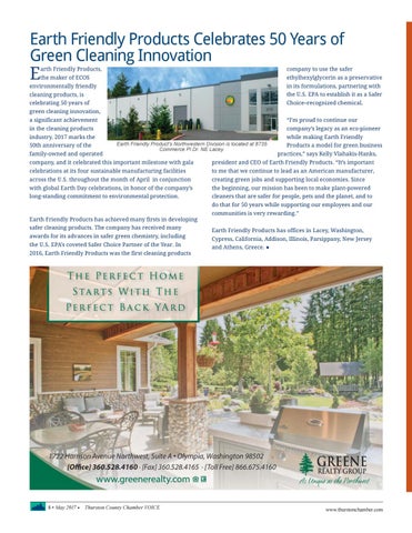 communities is very rewarding.” Earth Friendly Products has offices in Lacey, Washington, Cypress, California, Addison, Illinois, Parsippany, New Jersey and Athens, Greece. ●