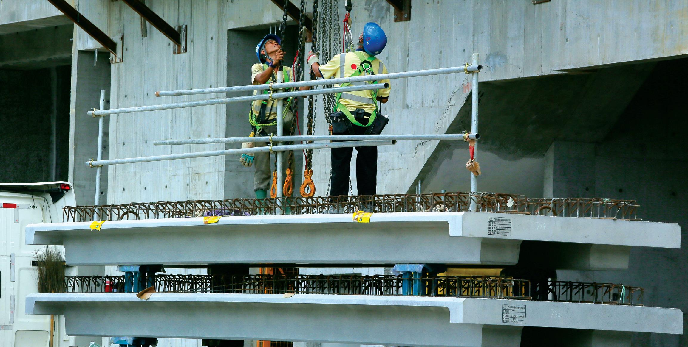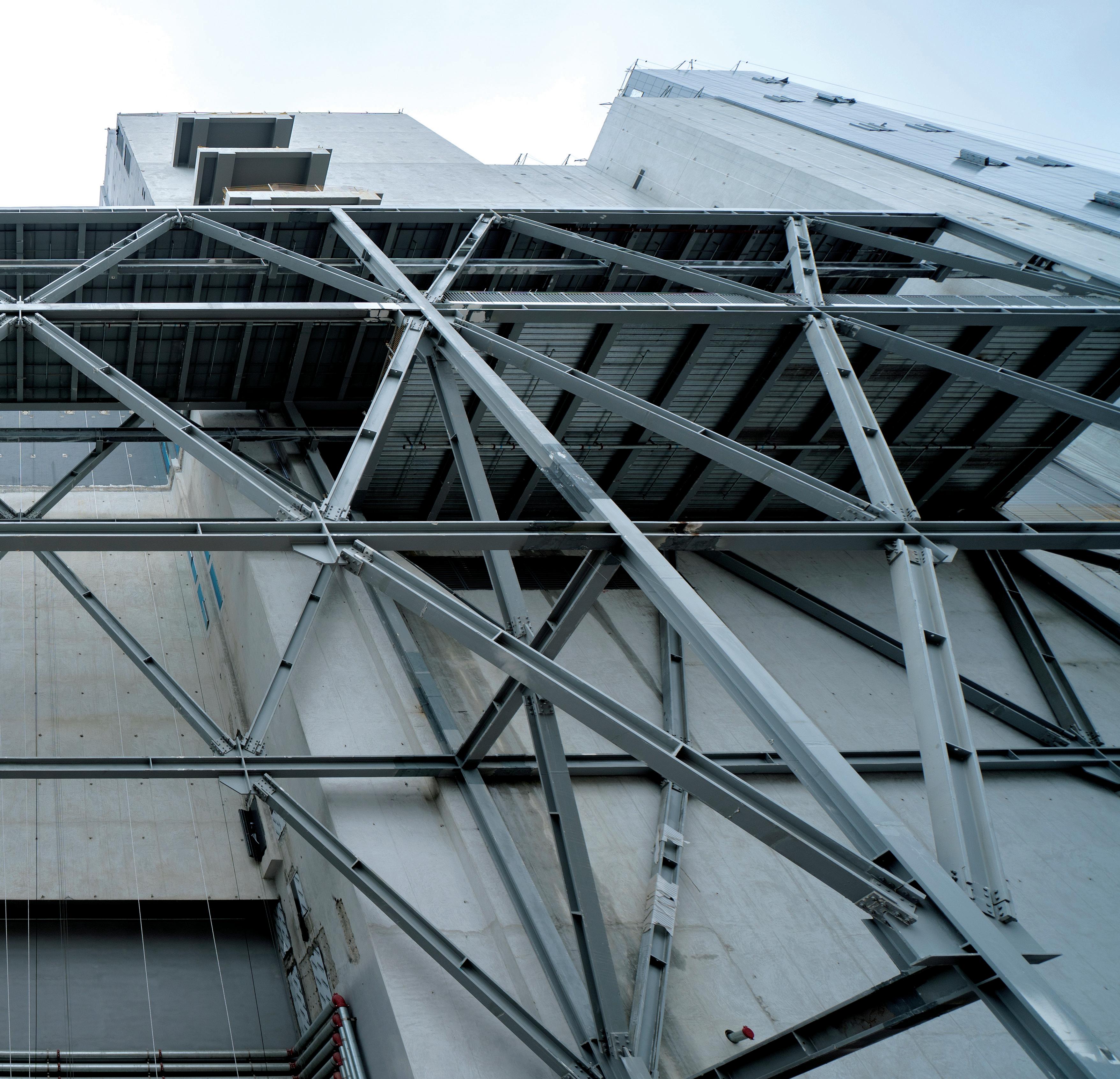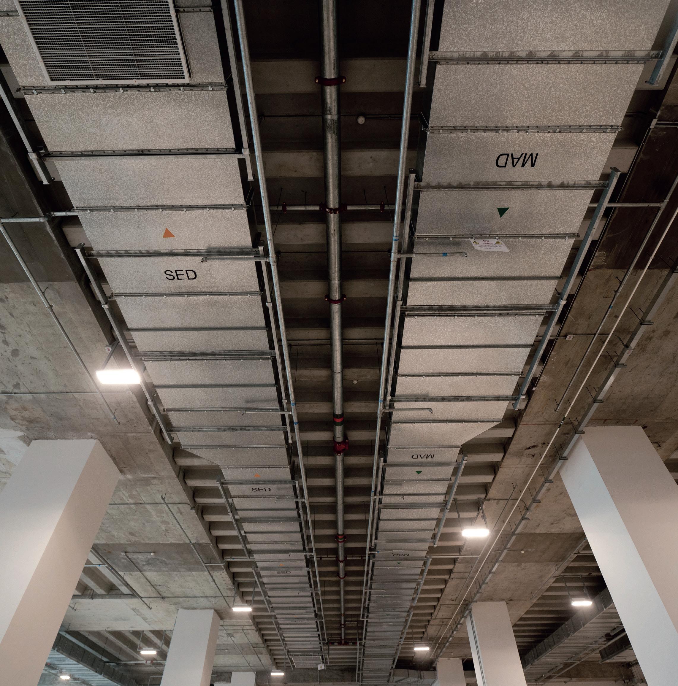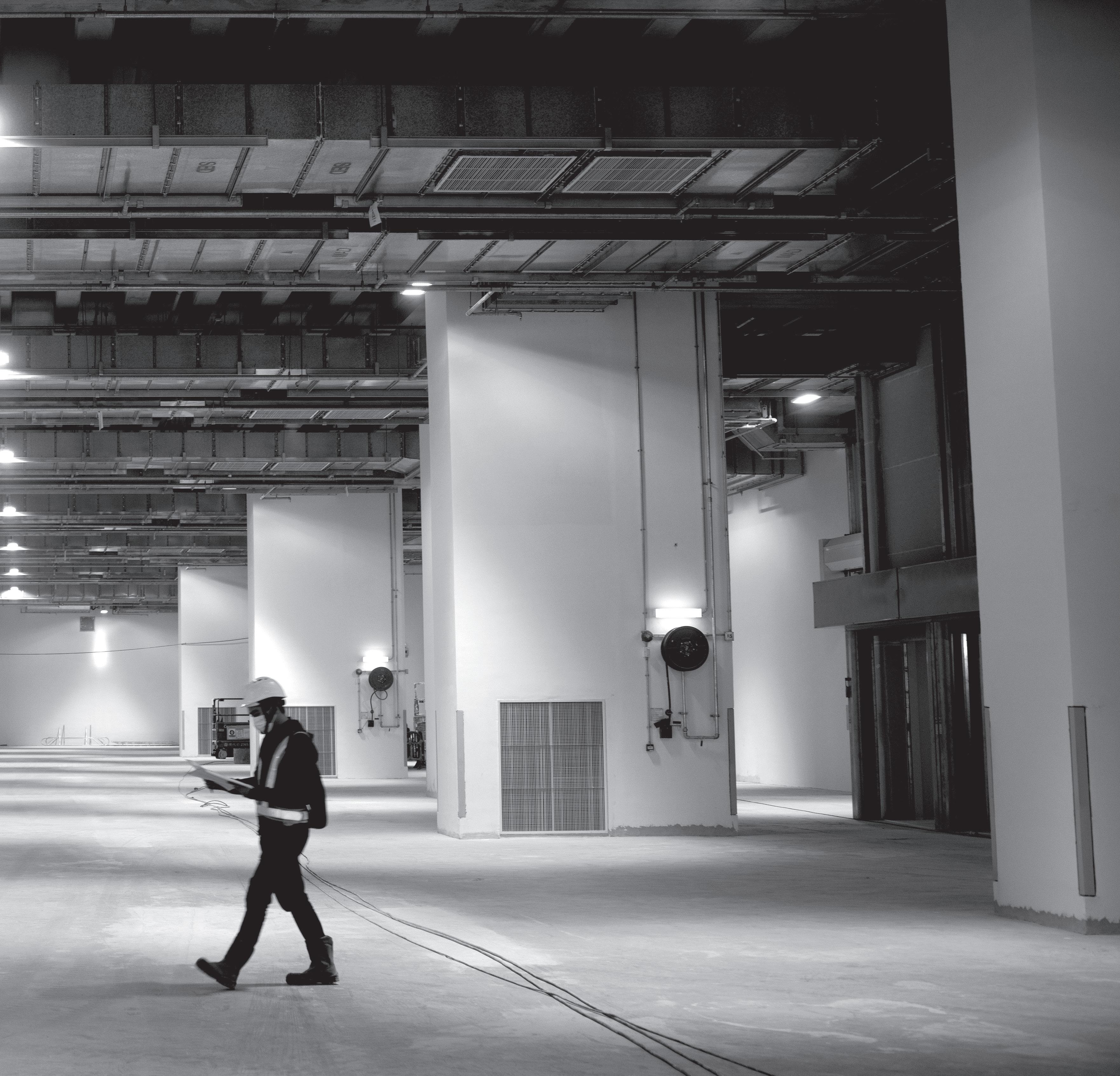 Innovative methods like the MiC and DfMA were used to standardise the construction sequence. Of particular note was the main contractor’s recommendation to complete the precast of the double tees in mainland China, assemble the prestressed beams to build the floors, with late-casted topping to achieve the FM2 standard, and to closely space the tee beams (1m c/c) to control the deflection and provide sufficient mass to limit the floor vibration: all of which reduced the column sizes and number of piles, required less demand on in-situ concrete, produced less wastage – and resulted in better quality outcomes overall.