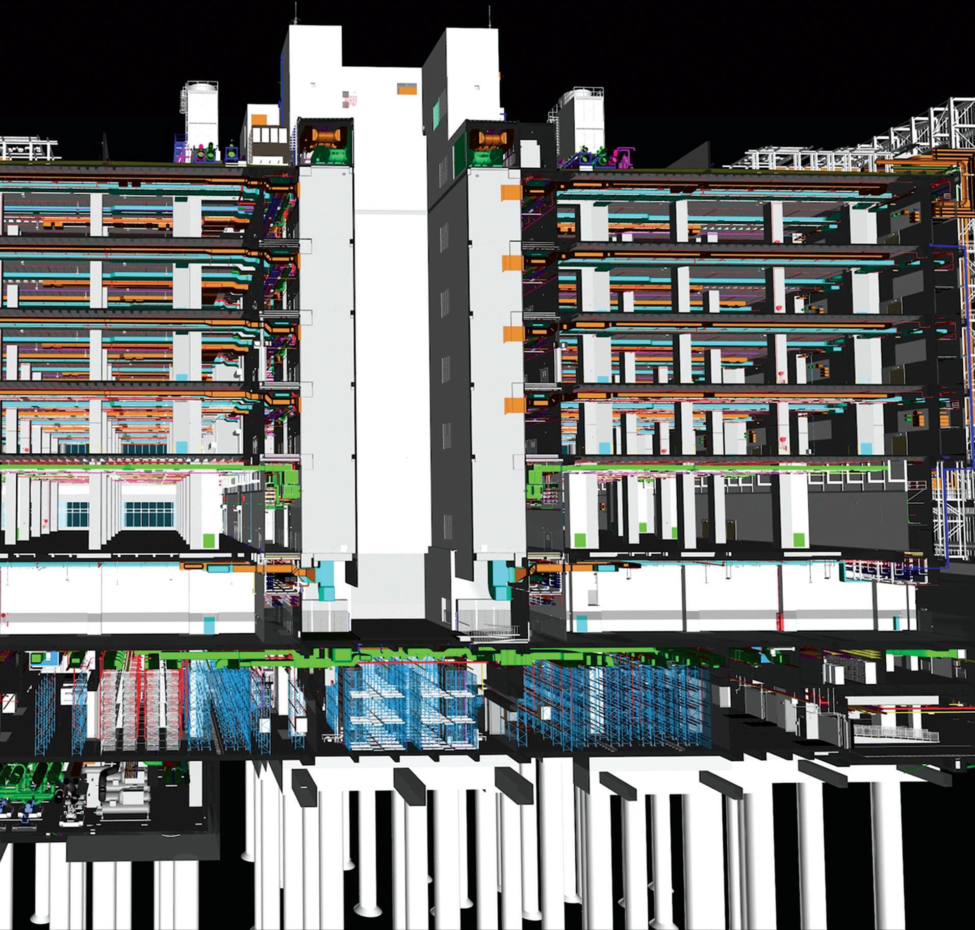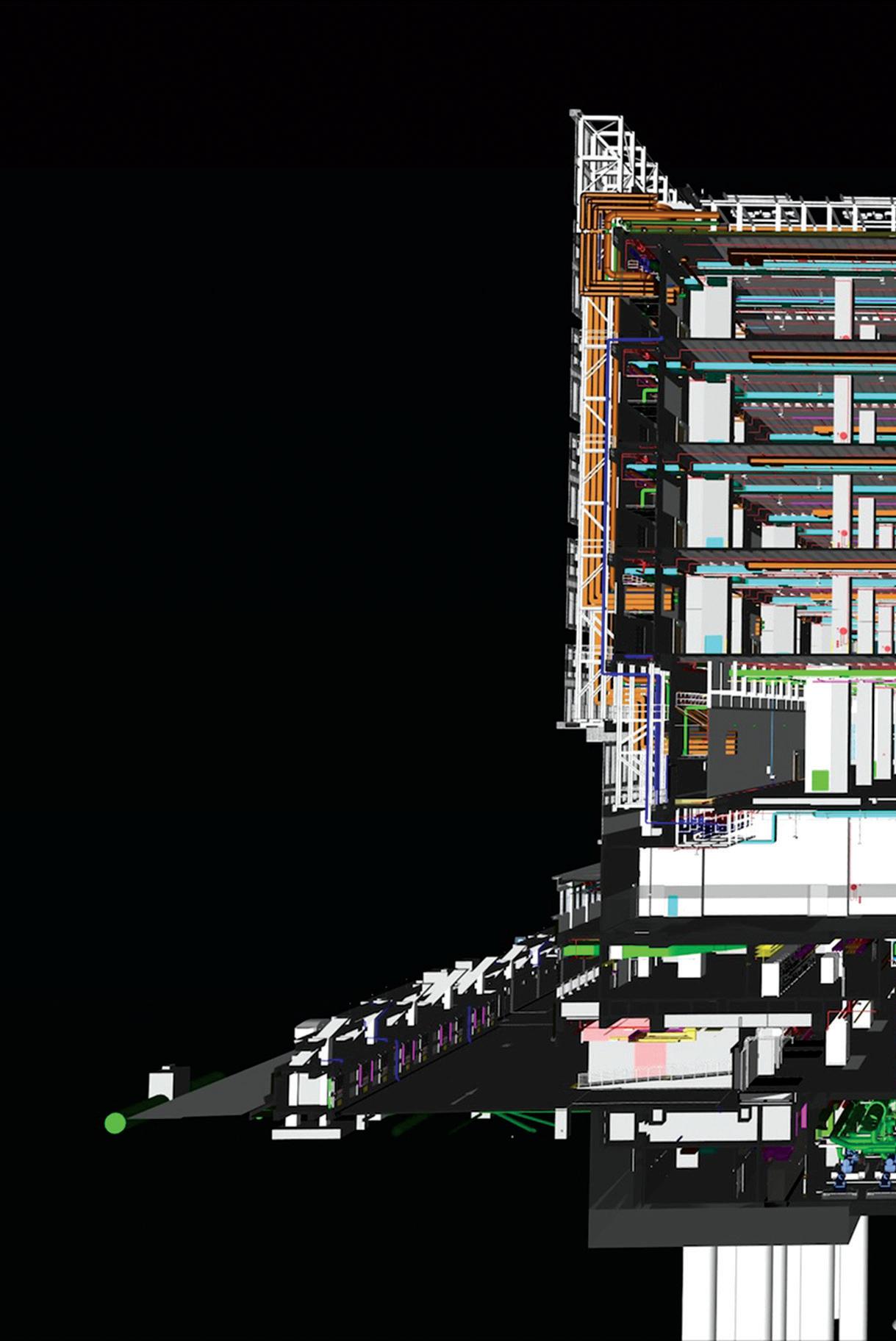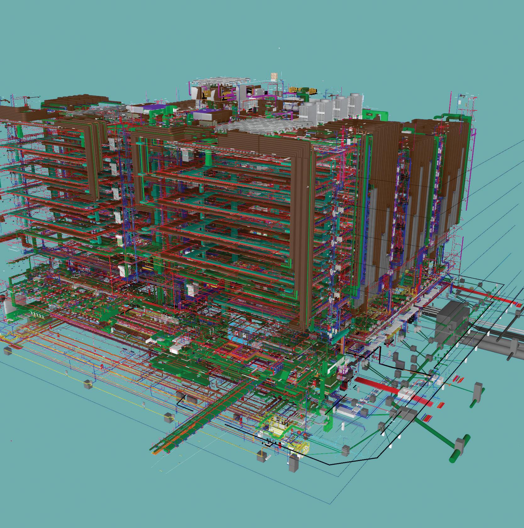 The use of BIM helped greatly in every step of the design-andbuild process. This smart technology proved critical on many fronts from coordinating the design, ensuring the compatibility of different sections to creating safe delivery and installation of major components of the building, including the chiller pump room, and the chilled water and seawater pipes.