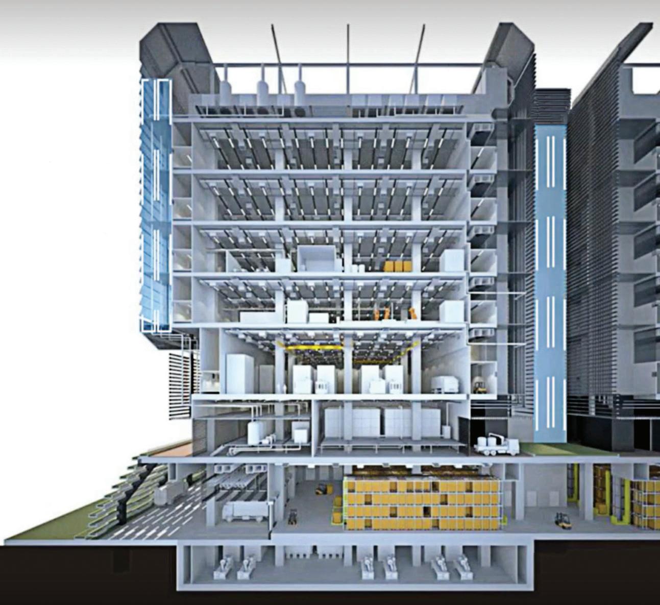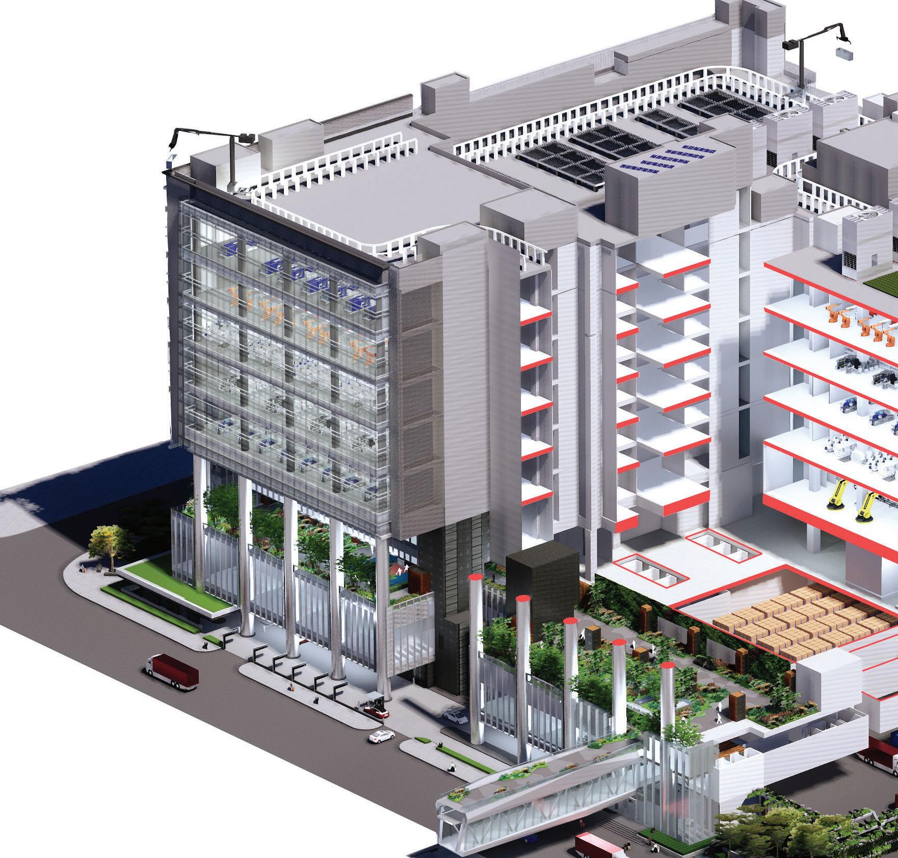 To integrate Industry 4.0 in the project, NS put forward key elements such as multifunctional production equipment that could be downsized, and the number of workers, space and energy consumption could be minimised. Flexible layouts for equipment and lean production of required quantities at set times became feasible. The functional arrangement of vertical logistics and building services by the use of common MEP spaces are specially designed for multi-layering of production spaces. Most importantly, to cater for common and conflicting requirements, modularisation of spaces was introduced. As the backbone of AMC, shared logistics would cover production on all floors.