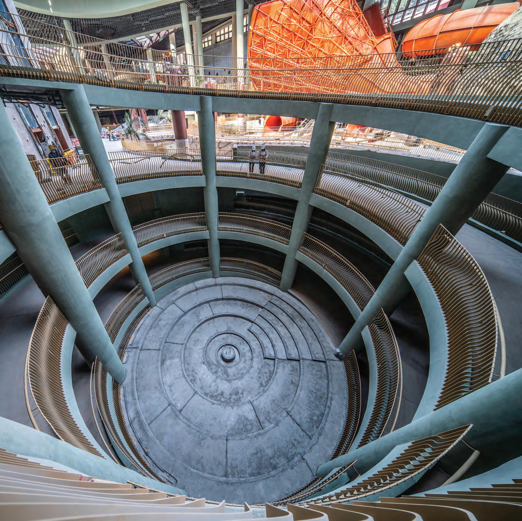 As in nature, there are no straight lines at Water World. Instead, curves, concave angles, raking columns and arcs rule this space. Terraced platforms and wave pools step back from the ocean front, while rides wrap around both the valley and a main structure that is topped with iconic disc-shaped roofs.