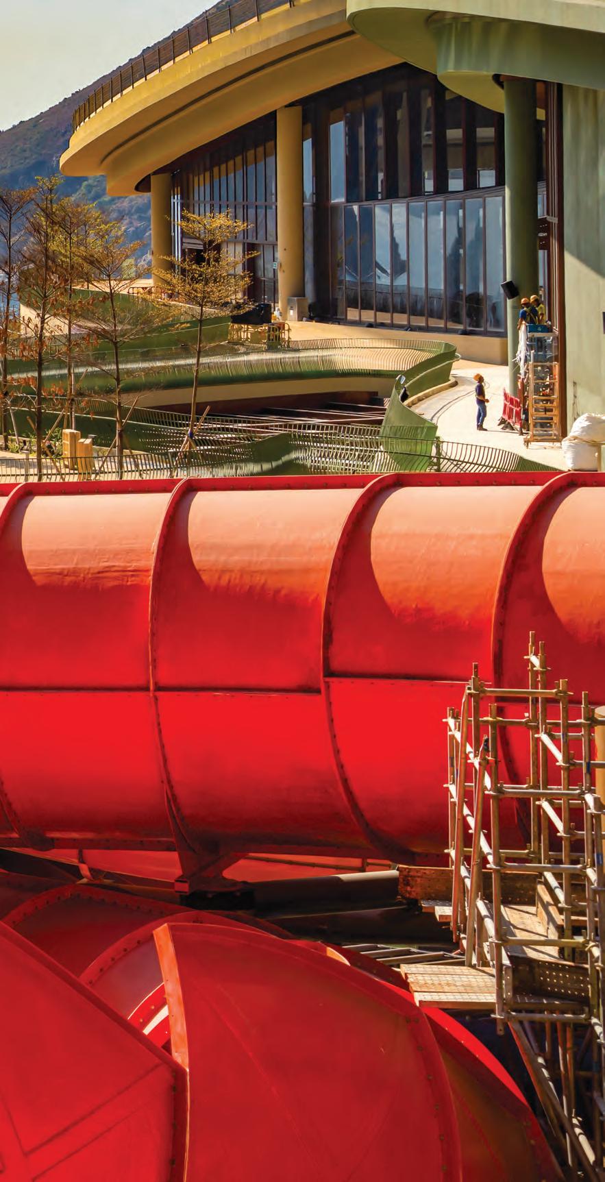 Nestled on the edge of Hong Kong Island’s southern coast, Water World Ocean Park Hong Kong looks out onto the expanse of the South China Sea, surrounded by the steep and densely forested hills so typical of the region’s landscape. It is this landscape that guided the unique design of the water park, in particular its main structure. The philosophy of the developer, Ocean Park Corporation, was to create a park that looked as if it had always been there, existing in harmony with the rest of the valley.
