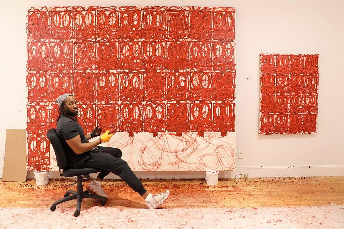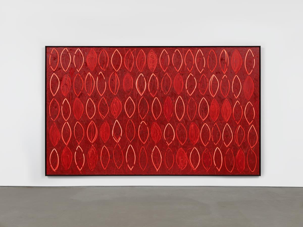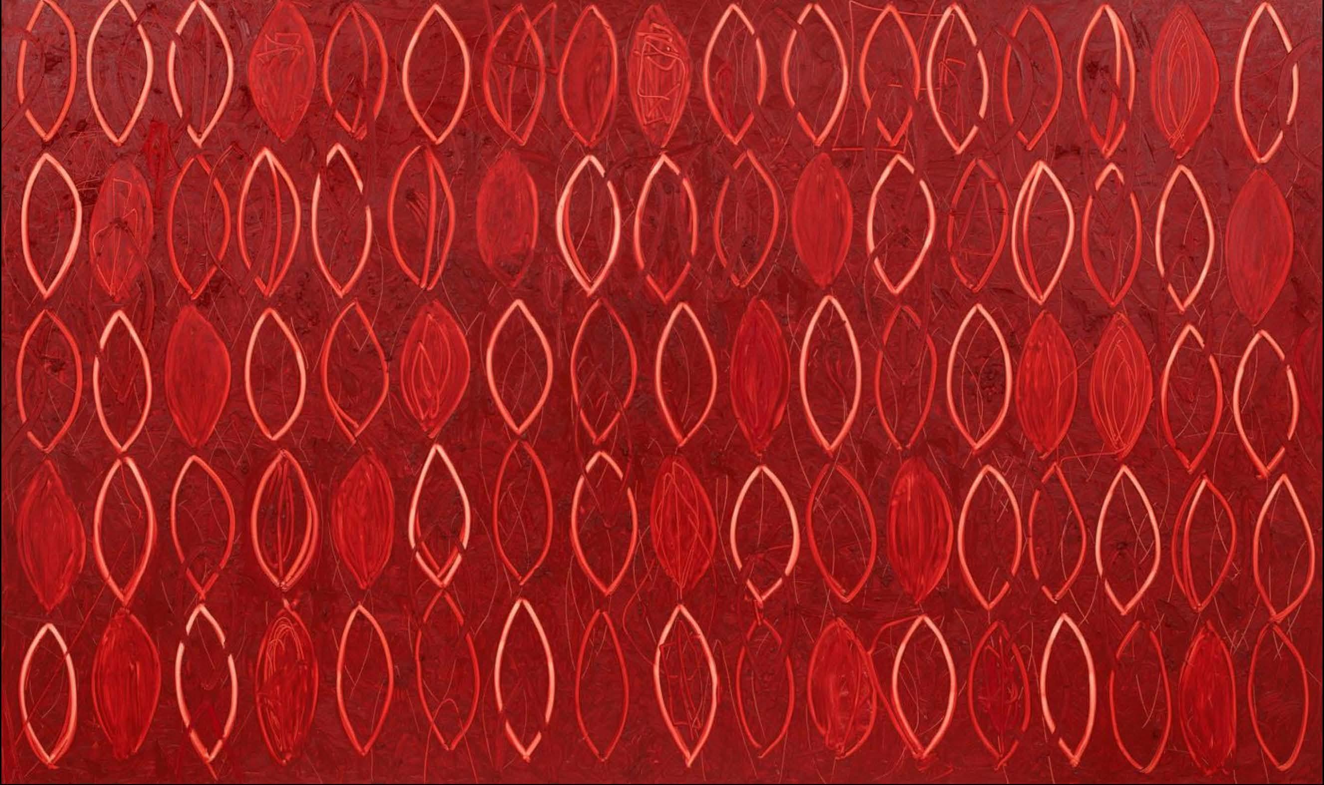 Rashid Johnson’s “God Painting ‘Through The Fire’” envelops the viewer in a field of blood‑red intensity. Markedbytherepeatedvesicapiscis,analmondshaped formwithancientspiritualresonance,thecanvasevokes a higher presence, alluding to divinity, soul, and the unseenenergiesthatshapehumanexperience.