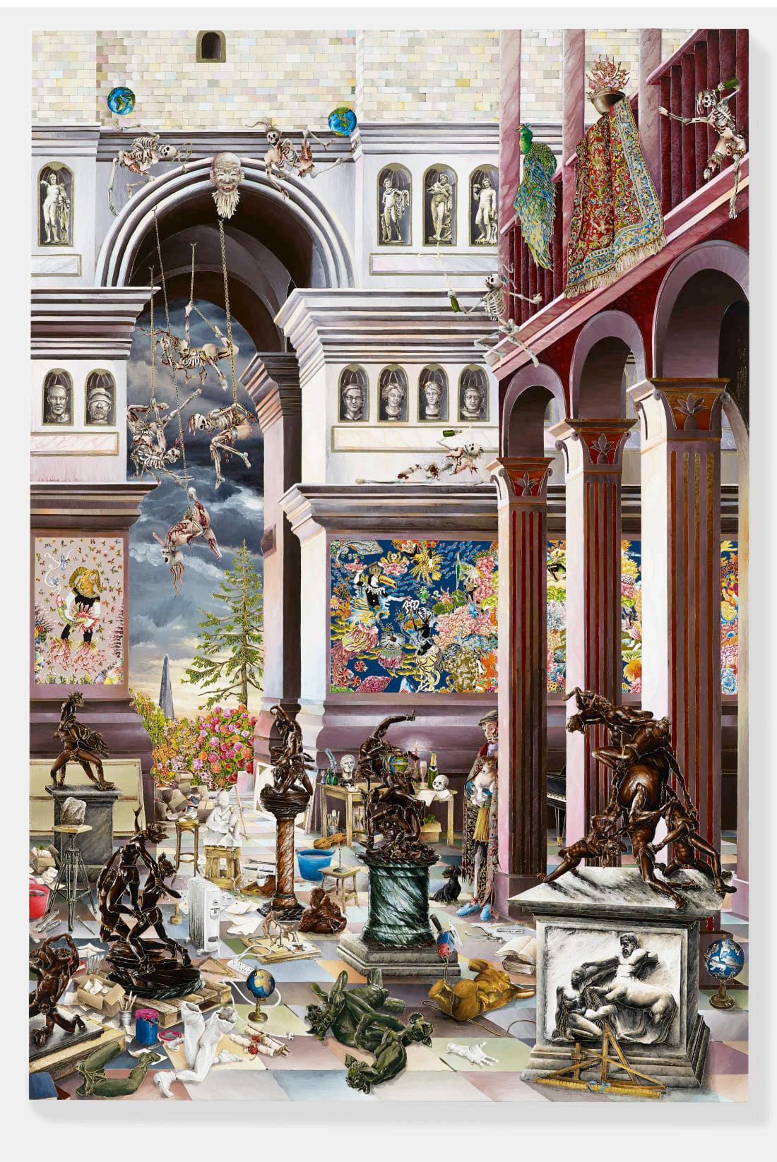 In “Self Portrait in the Sculpture Studio at Peckham (after Mocetto) I”, Raqib Shaw explores the threshold not only through a plethora of pillars, domed archways, and fantastical hybrid creatures in the composition, but also through his distinctive cloisonné influenced technique. Using thick gold acrylic liner, Shaw demarcates the borders of his composition with precision Within these gilded outlines, he pours pools of paint, each one held in place, confined within the gilded boundaries This delicate yet unyielding line becomes both barrier and ornament, a visual threshold that contains and controls Shaw’s work reveals the tension of ornamental confinement, how beauty and captivity can be so finely interwoven that the boundary becomes both aesthetic choice and symbolic constraint
