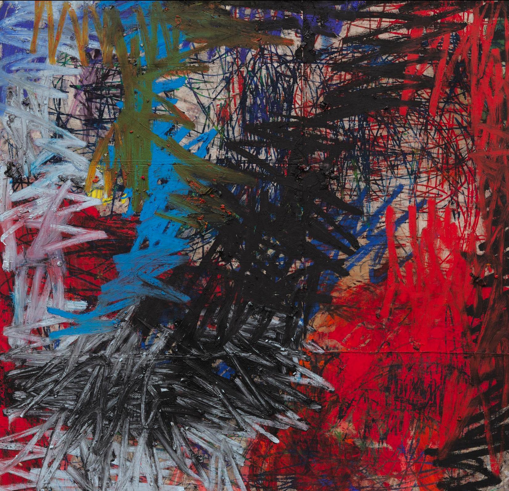 Oil, oil stick, spray paint, dirt and graphite on canvas and linen