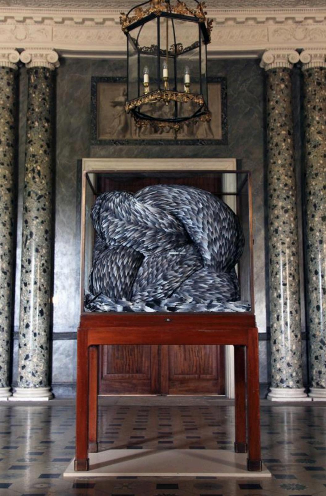 Mixed media with pigeon feathers in an antique museum cabinet 72 by 43 31 by 24 inches (182 8 x 110 x 60 9 cm)