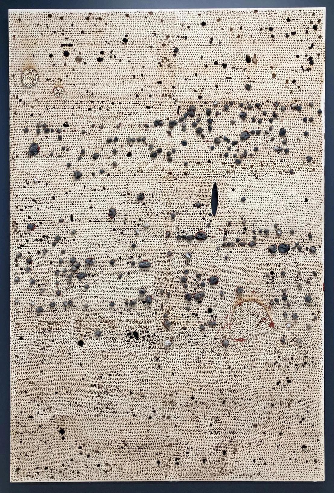 Wall relief made with polymer gypsum, pigment drips, plaster 115 by 94 by 2.625 inches (292.1 x 238.8 x 6.7 cm)