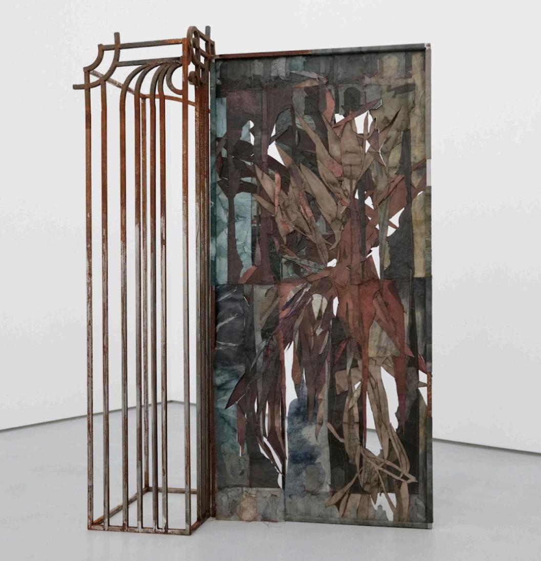 Libyan artist Nour Jaouda explores the gate not only as a physical barrier, but as a threshold: a site of interaction, tactility, and transformation In her installation “Untitled (brown)”, the gate becomes both structure and symbol A vertical steel frame reminiscent of architectural silhouettes from Cairo and London, holds together torn, botanically dyed textiles in ochres, greens, and flesh tones The materials, sourced between Cairo and London, reflect the artist’s diasporic movement and map a visual geography of cultural in-betweenness.