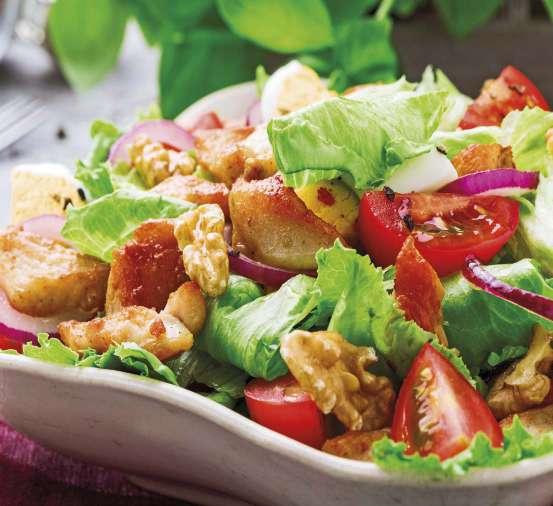 Ensalada de pollo con nueces, salsa de mostaza y miel