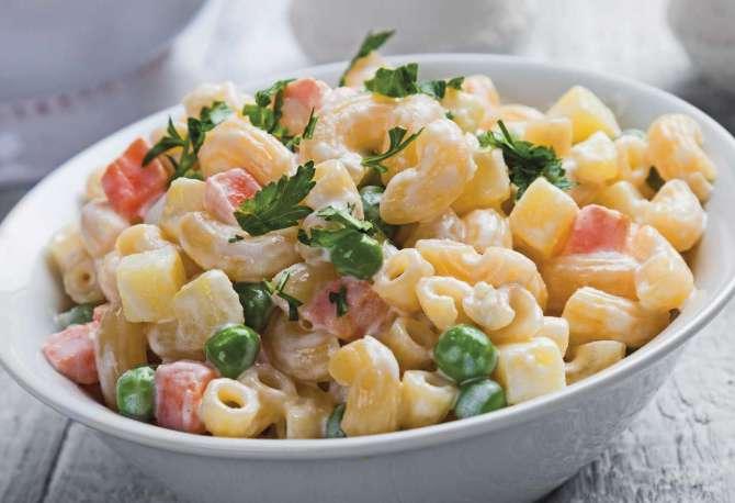 Preparación ensalada fideos: Colocar en una olla agua a fuego alto. Cuando hierva incorporar la sal y la pasta. Cocinar el tiempo que indique el paquete de pasta. Sacarla, escurrirla bien y dejarla enfriar. Cocina paralelamente las arverjitas y las zanahorias con un poco de sal. Ten cortados en cuadritos el queso mozarella. Mezcla en un recipiente amplio la pasta, con el resto de ingredientes cortados.