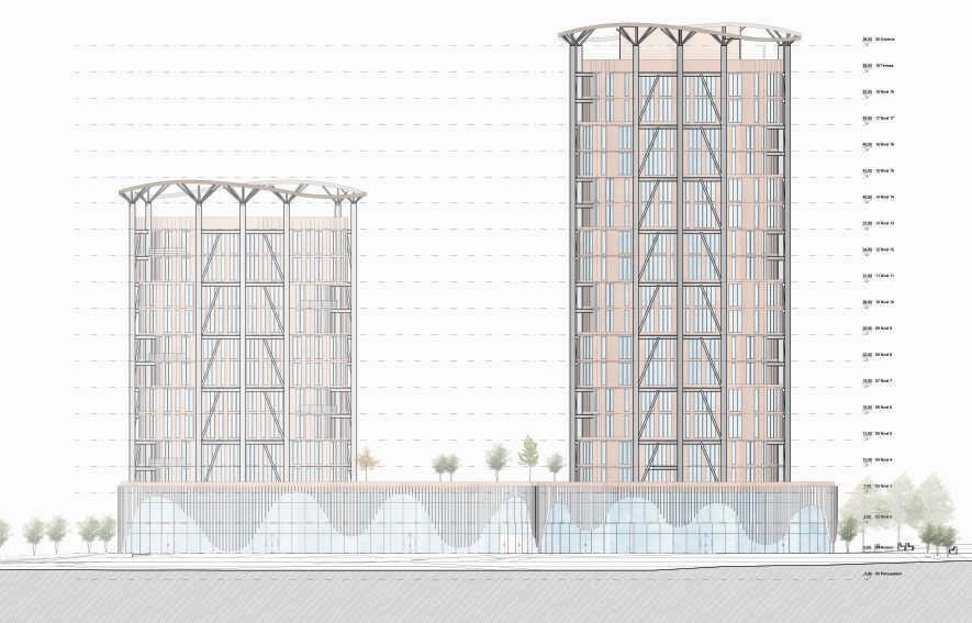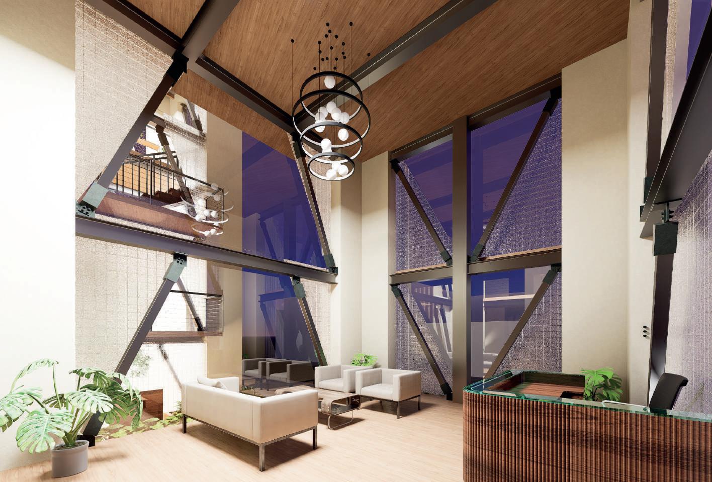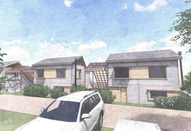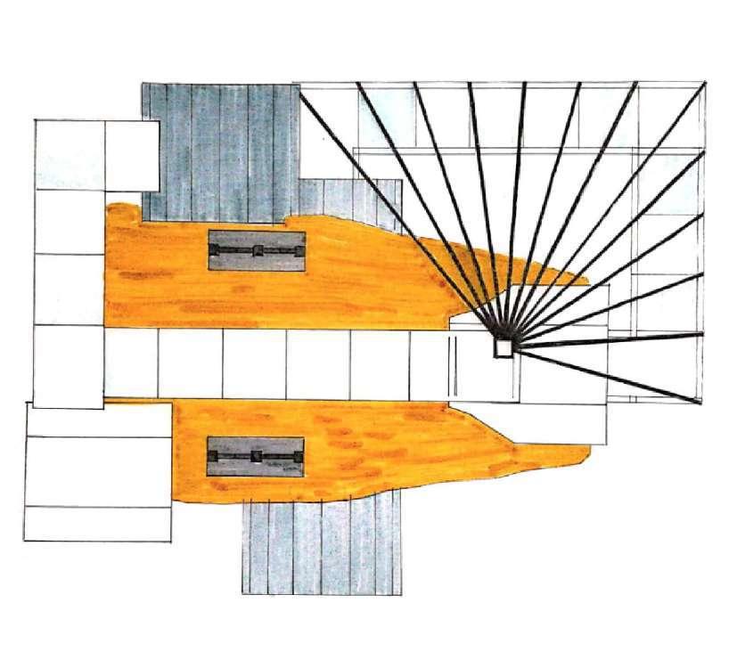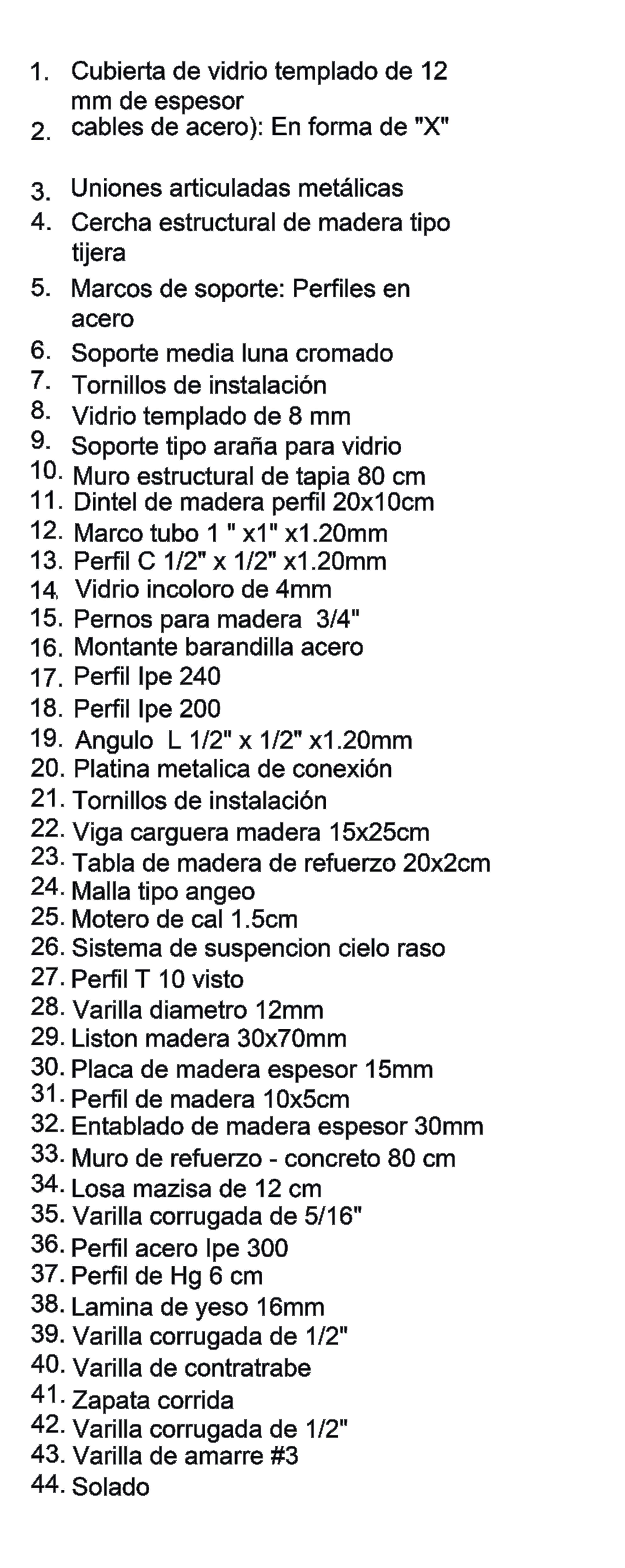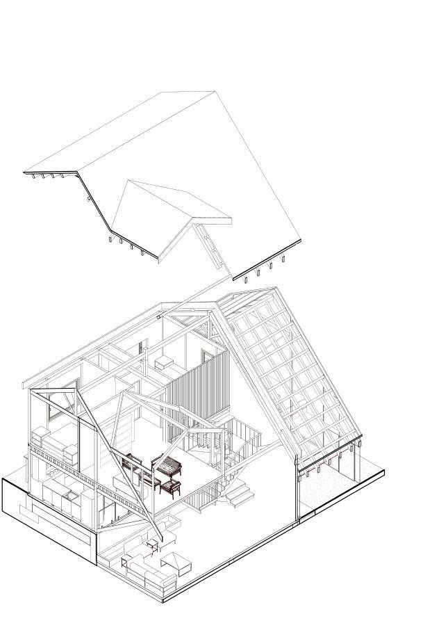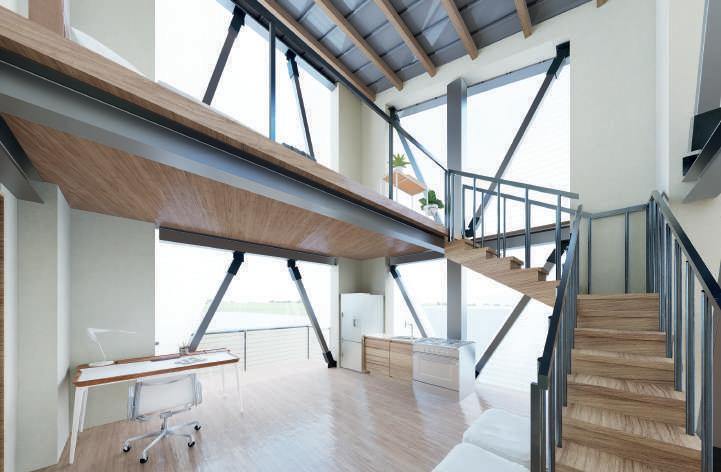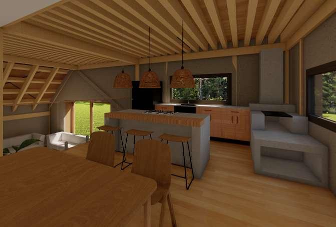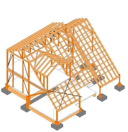 Sistema estructural de seccion activa basado en pórticos de madera que cuentan con columnas de 15*15 y vigas de 15*20. Se encuentra reforzado mediante la utilizaciónde riostras de acero.