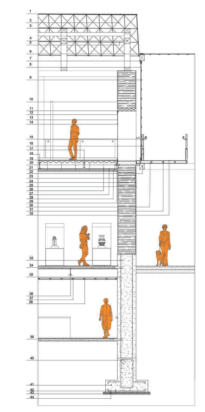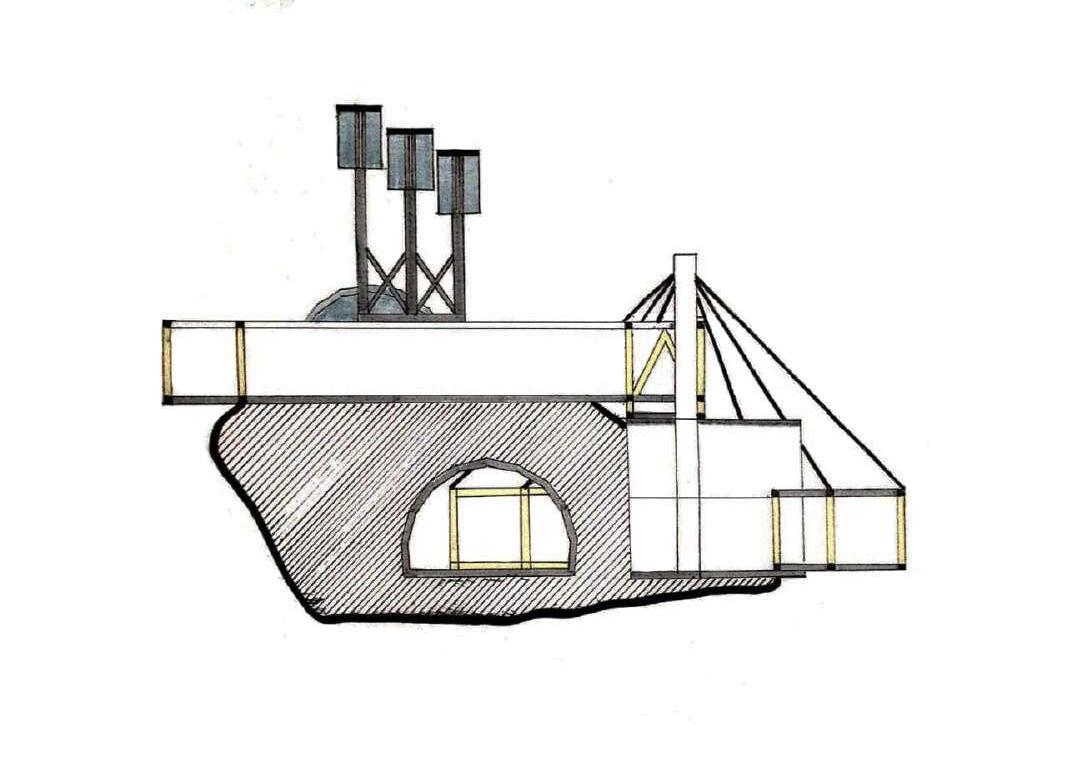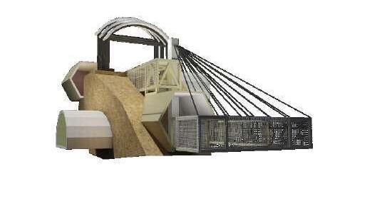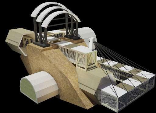 Sistema estructural basado en muros portantes de Tapia el cual funciona en conjunto con un sistema de vigas en madera. Ademas de incluir un puente cuya estructura se basa en un sistema aporticado de madera.