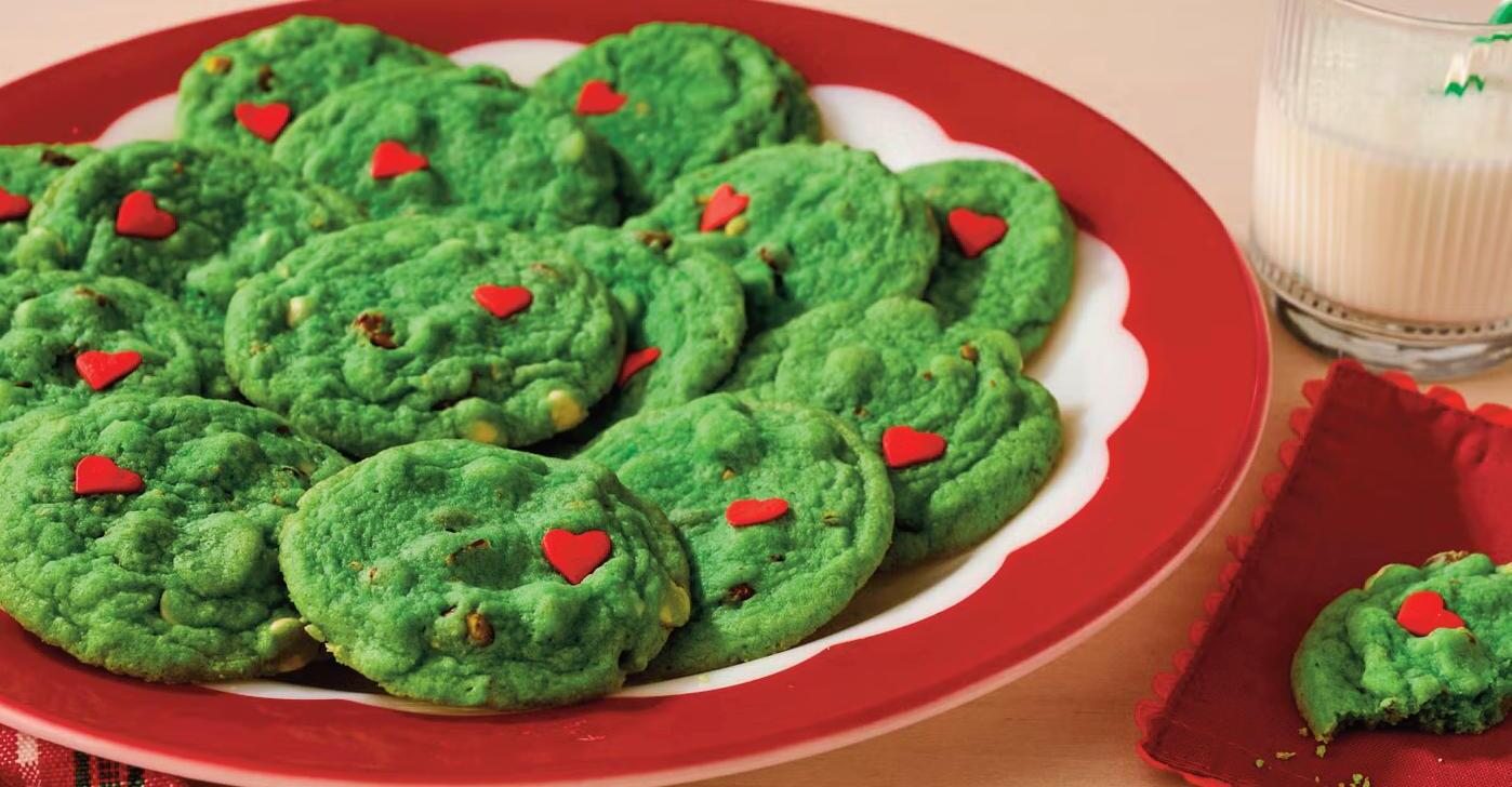 Precalienta el horno a 325 ℉. Forre 2 bandejas para hornear con papel pergamino.2En un tazón mediano, mezcle la harina, el bicarbonato de sodio, la sal y la mezcla para pudín 3En el tazón de una batidora de pie equipada con el accesorio de paleta, bata la mantequilla, el azúcar granulada y el azúcar moreno a velocidad media-alta hasta que estén suaves y esponjosos, aproximadamente 3 minutos. Reduzca la velocidad a baja. Agrega los huevos, uno a la vez, luego la vainilla Agregue la cantidad deseada de colorante alimentario verde, si lo usa, y mezcle hasta que se combinen. Agregue la mezcla de harina y mezcle hasta que esté combinado Incorpora las chispas de chocolate blanco y los pistachos a mano.4Forme bolas de 2 cucharadas con la masa y colóquelas en las bandejas para hornear preparadas a una distancia de aproximadamente 2 pulgadas. Presione un corazón espolvoreado descentrado en cada bola de masa Hornee hasta que esté listo, de 14 a 15 minutos.5Deje enfriar durante 5 minutos en las bandejas para hornear, luego transfiéralo a una rejilla para que se enfríe por completo Deje que las bandejas para hornear se enfríen, luego repita con la masa restante para galletas.