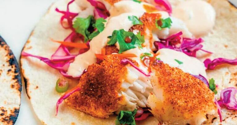 Assemble the tacos by topping the tortillas with fish, slaw, and sauce Top with chopped cilantro and a spritz of lime