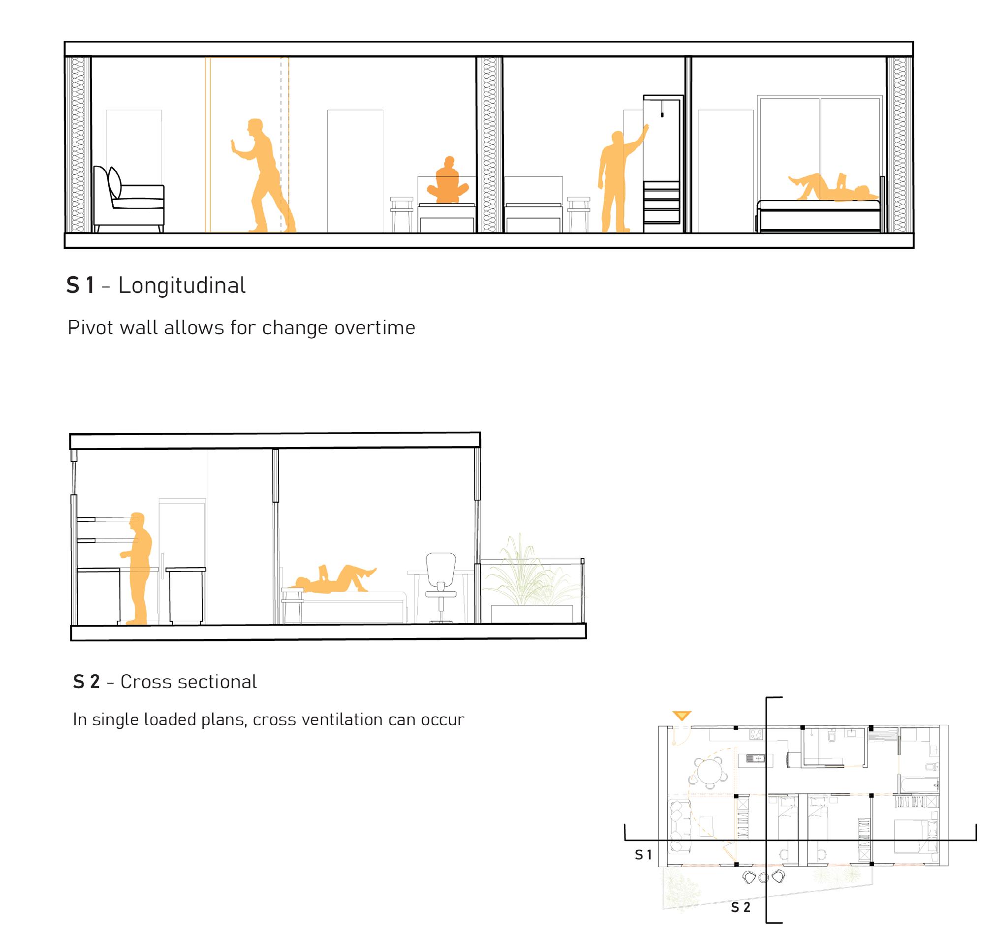 Each unit follows a 3m x 3m grid. Within this grid is a modular wall unit. As an intergenerational housing complex, needs change as peoples needs change, children move, grandparents join, this modular wall adapts the space to the needs of the family throughout their lifetime needs.