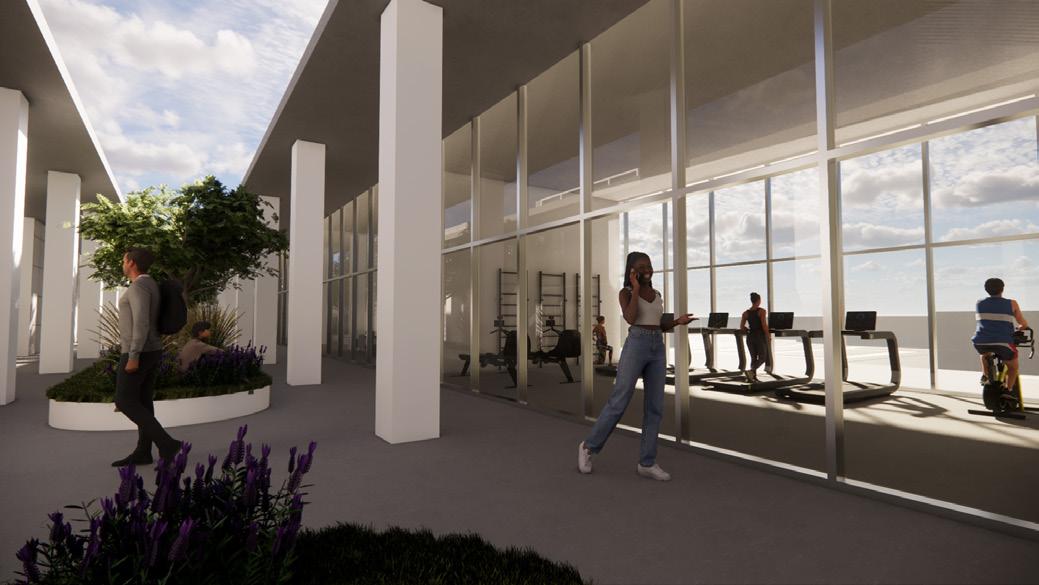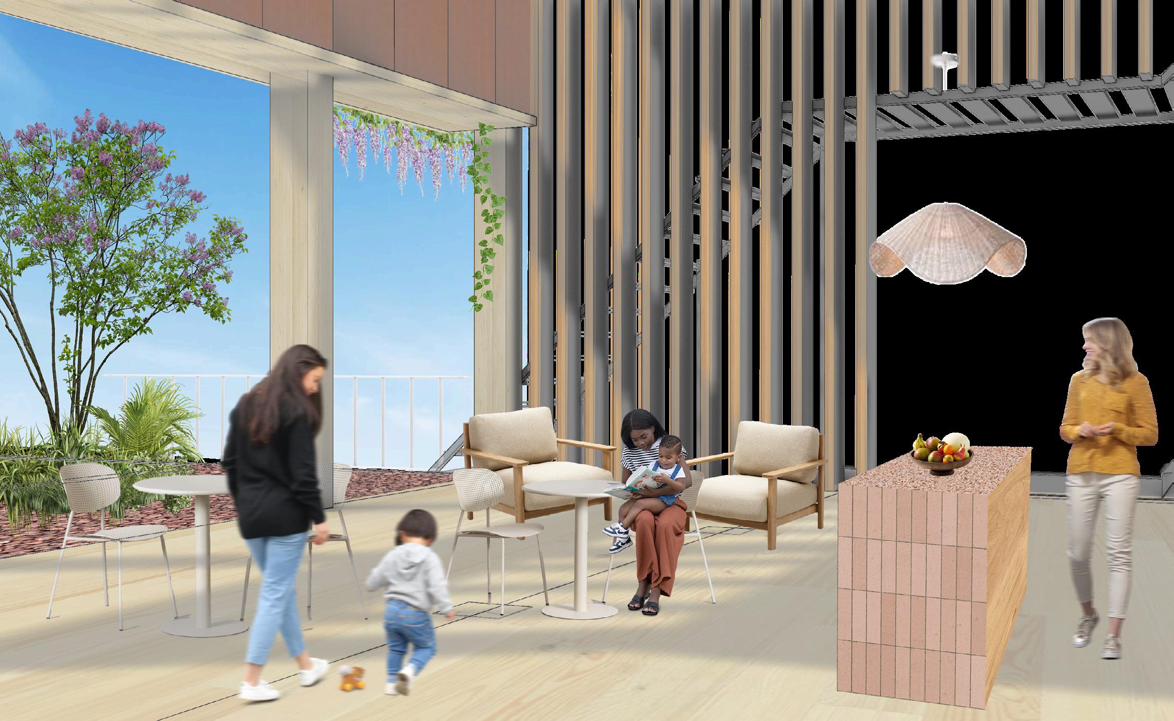 themselves are gathering points for flourishing community. Each floor has a typology, either a library hall with reading nooks, a green hallway to encourage gardening and lastly an artistic hallway to encourage connection through creativity.