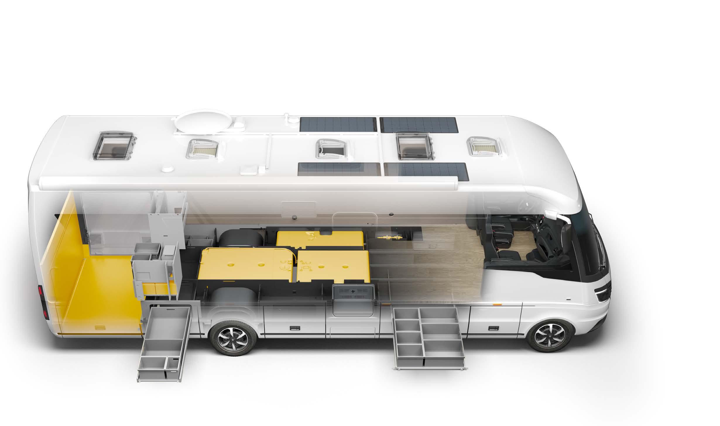 1 Rear garage with plenty of room for your luggage 2 Lithium battery pack* for self-sufficient energy supply 3 Fresh water tank 370 litres 4 Black water tank* 200 litres 5 Waste water tank 250 litres 6 Water filter* with UV light Our new, highly functional double floor ensures everything always goes smoothly, especially under the surface. This is where all of the important tanks and smart technology elements are hidden away, such as the powerful lithium batteries and our pressure water system – which is also available, if desired, with a UV water filter system for maximum self sufficiency. *optional extra 1 2 3 5 4 6 52 TECHNOLOGY