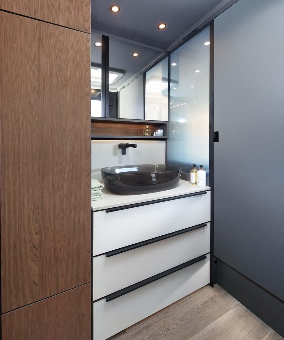 Our bathroom always gives you the privacy you need right where you need it. With a smoked glass sliding door between the shower and toilet and flexible dividing walls between the sleeping and living areas for an enclosed en suite bathroom. 34 BATHROOM