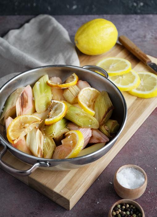 4. Die Zitrone halbieren und in etwa 5 mm dicke Scheiben schneiden. Anschliessend gleichmässig über den Lauch verteilen.