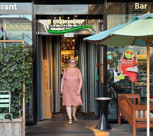 Baumnüssen oder Granatapfelkernen, den ich mir inzwischen längst auch zu Hause zubereite. Als neugierige Geniesserin schöpfe ich am tibits Buffet jedes Mal etwas, das ich noch nicht kenne. Besonders die Salate mit Linsen, Bohnen oder Kichererbsen inspirieren mich, zu Hause ähnlich kreative Kombinationen auszuprobieren, zumal ich seit einigen Jahren kein Fleisch mehr zubereite und höchstens ab und zu Fisch auf den Teller kommt. In den Restaurants jedoch fehlt es mir bei den vegetarischen Menüs oft an genügend Protein. Umso mehr schätze ich die tibits Auswahl mit den vielen proteinreichen Möglichkeiten. Wobei ich beim Dessert doch meistens wieder bei meinem heiss geliebten Cheesecake lande… Kürzlich traf ich mich an einem Nachmittag mit einem älteren Herrn aus dem Glarnerland für eine Buchbesprechung am Bahnhof Stadelhofen. Er hatte Lust auf ein Glas Wein und dazu wohl so etwas wie ein Zvieriplättli, doch ich führte ihn – wie könnte es auch anders sein? – ins tibits. Nach einem kurzen und enttäuschten Blick aufs Buffet studierte er etwas verloren die Getränketafeln und schloss sich schliesslich meinem Wunsch nach einem Mango-Lassi an. Innerlich musste ich schmunzeln, denn wäre er mein Date gewesen, wäre er definitiv durchgefallen. Für mich ist klar: Kein Lokal ist besser für ein erstes Date geeignet als ein tibits. Wenn er oder sie hilflos-gelangweilt vor dem Buffet steht oder wenn die wunderbaren Speisen keinen Anklang finden, dann Vorsicht, Red Flag! Und das Beste an diesem Dating-Ort: Man muss nicht noch warten, bis endlich die Rechnung kommt! Ich bin seit 13 Jahren verwitwet und habe gelernt, auch das Alleinunterwegssein zu schätzen. Ich date nicht im tibits, sondern das tibits. Sei es nach einer Wanderung, nach einem Museumsbesuch oder während eines Städtebummels − stets mit dem Zug unterwegs lernte ich inzwischen die tibits Lokale in Aarau, Basel, Winterthur, Lausanne, Luzern und Bern kennen, und die Einrichtung im tibits Stil war jedes Mal eine Überraschung. Doch auch das Vertraute war stets von Anfang an da: Dank den mir bekannten Speisen am Buffet fühle ich mich in jedem neuen tibits gleich heimisch. Etwas, das ich als Solistin umso mehr zu schätzen