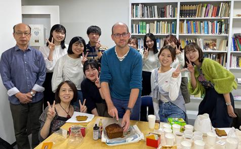 Kruzslicz Tamás (középen) egy magyar tanszéki összejövetelen a hallgatókkal és kollégáival Oszakában.