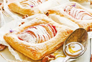 Az almákat vékonyan szeleteld fel, a leveles tésztát pedig vágd fel 10x10 centis négyzetekre. A tészta közepét