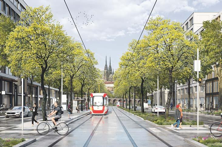 Rok 2026 přinese krok k proměně jižního centra Brna: začíná výstavba severního úseku nového městského bulváru, páteřní komunikace čtvrti Trnitá, která má v budoucnu propojit nové hlavní nádraží s historickým jádrem města. Stavba má odstartovat v lednu 2026 a potrvá 16 měsíců. Nový úsek, který propojí ulici Uhelnou s Opuštěnou a překříží ulici Fuchsovu, nabídne dva jízdní pásy se dvěma pruhy v každém směru, doplněné o široké chodníky a obousměrné cyklostezky. Součástí stavby je i kompletní vybudování technické infrastruktury – od kanalizace, horkovodu a vodovodu až po veřejné osvětlení a optické sítě. Prostor navíc oživí nové stromořadí a záhony, do nichž se svede dešťová voda ze zpevněných ploch. Vizualizace: Brněnské komunikace / KAM