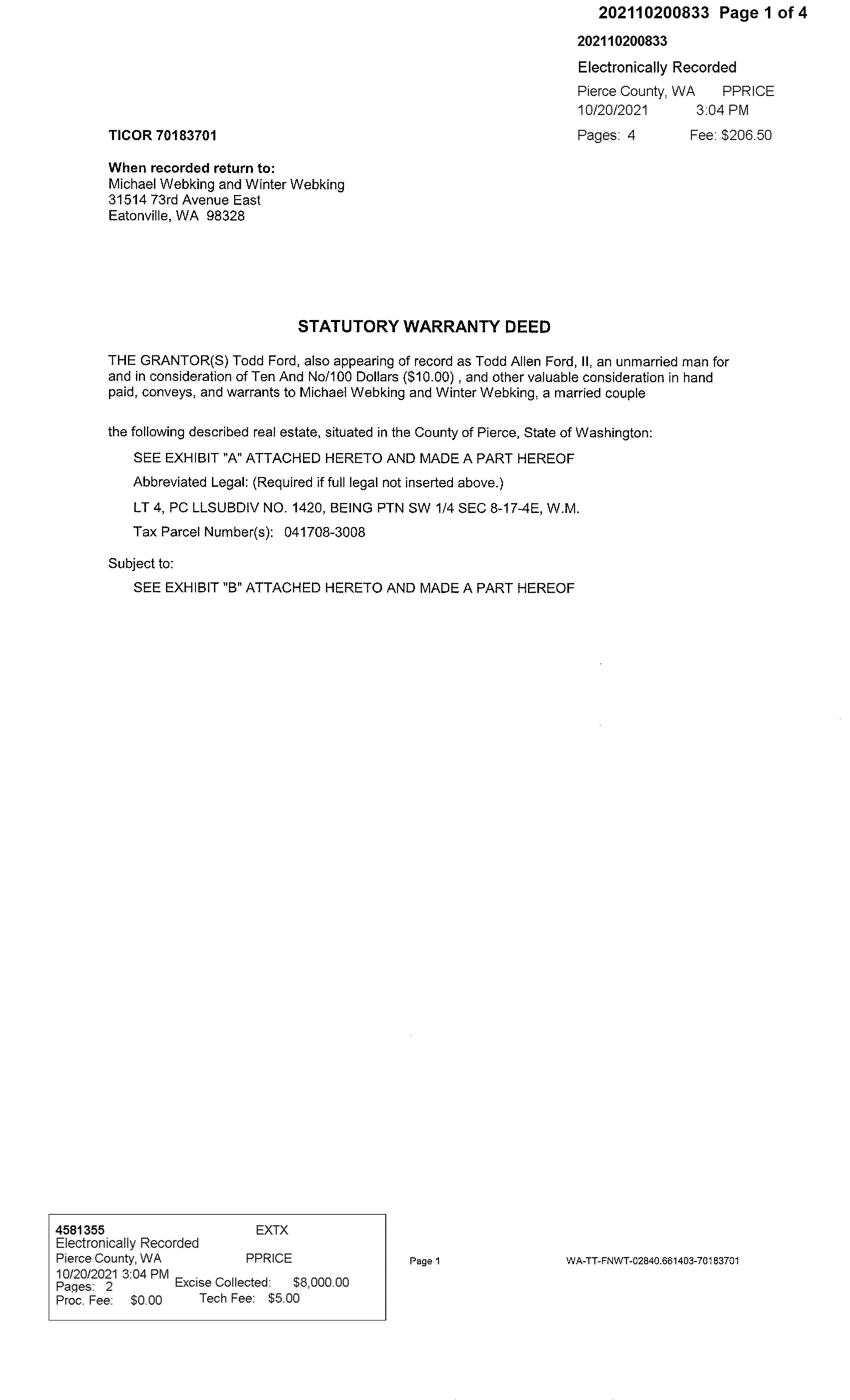 Page 4 Mortgage Date Document Type Mortgage Rate Change Freq Loan Amount $400,000 Document Description Conventional 1st Periodic Floor Rate Loan Type Conventional Recording Date 10/20/2021 1st Periodic Cap Rate Origination Lender Name CHANGE LENDING LLC Origination Interest Rate Lifetime Cap Rate Origination Lender Type Mortgage company First Rate Change Date Change Index Type Financing Maturity Date 11/01/2051 IO Period Borrower 1 WEBKING, MICHAEL Balloon Rider Prepayment Penalty Rider Borrower 2 WEBKING, WINTER Fixed/Step Rate Rider Prepayment Penalty Term Additional Borrowers Adj Rate Rider Adj Rate Index Vesting Transfer Transaction ID 4 Recorder Doc Number 202110200833 Partial Interest Transferred Sale Date 10/08/2021 Document Type Deed Type of Transaction Arms-Length Transfer Sale Price $581,699 Document Description Warranty Deed Multiple APNs on Deed Recorder Book/Page Recording Date 10/20/2021 Property Use Single Family Residential Buyer 1 WEBKING, MICHAEL Buyer 1 Entity Married Couple Buyer Vesting Buyer 2 WEBKING, WINTER Buyer 2 Entity Married Couple Buyer Mailing Address 31514 73RD AVE E, EATONVILLE, WA 98328-9642 Seller 1 FORD, TODD Seller 1 Entity Unmarried Man Seller Mailing Address Seller 2 FORD II, TODD ALLEN Seller 2 Entity Individual Legal City/ Muni/ Township Legal Recorder's Map Ref VOL 15 PG 20 Legal Subdivision PIERCE COUNTY LARGE LOT SUBDIVISION NO 1420 Legal Section/ Twn/ Rng/ Mer NW4SW4 S08T17NR04E WM Legal Brief Description/ Unit/ Phase/ Tract Title Company Name TICOR TITLE Mortgage Release Transaction ID 5 Recorder Doc Number 202006220156 Loan Amount Effective Date 06/19/2020 Document Type Release Origination Doc # 201808270454 Borrower(s) Name TODD ALLEN FORD II, AS HIS SEPARATE ESTATE Document Description Release of Mortgage Origination Recording Date 08/27/2018 Current Lender UPF WASHINGTON, INCORPORATED, AS TRUSTEE Recording Date 06/22/2020 Original Lender OBEE CREDIT UNION Mortgage Transaction ID 6 Recorder Doc Number 202004200410 Recorder Book/Page Mortgage Date 04/14/2020 Document Type Mortgage Rate Change Freq Monthly Loan Amount $62,500 Document Description Credit Line 1st Periodic Floor Rate Loan Type Credit Line Recording Date 04/20/2020 1st Periodic Cap Rate Origination Lender Name O BEE CU Origination Interest Rate Lifetime Cap Rate Origination Lender Type Credit Union First Rate Change Date Change Index Type Financing Variable Maturity Date IO Period Borrower 1 FORD, TODD Balloon Rider Prepayment Penalty Rider Borrower 2 Fixed/Step Rate Rider Prepayment Penalty Term