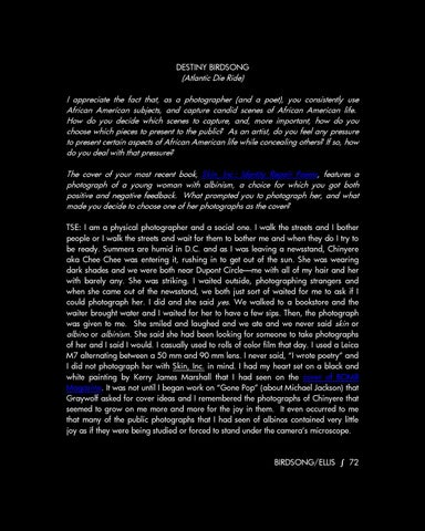 I appreciate the fact that, as a photographer (and a poet), you consistently use African American subjects, and capture candid scenes of African American life. How do you decide which scenes to capture, and, more important, how do you choose which pieces to present to the public? As an artist, do you feel any pressure to present certain aspects of African American life while concealing others? If so, how do you deal with that pressure? The cover of your most recent book, Skin, Inc.: Identity Repair Poems, features a photograph of a young woman with albinism, a choice for which you got both positive and negative feedback. What prompted you to photograph her, and what made you decide to choose one of her photographs as the cover? TSE: I am a physical photographer and a social one. I walk the streets and I bother people or I walk the streets and wait for them to bother me and when they do I try to be ready. Summers are humid in D.C. and as I was leaving a newsstand, Chinyere aka Chee Chee was entering it, rushing in to get out of the sun. She was wearing dark shades and we were both near Dupont Circle––me with all of my hair and her with barely any. She was striking. I waited outside, photographing strangers and when she came out of the newsstand, we both just sort of waited for me to ask if I could photograph her. I did and she said yes. We walked to a bookstore and the waiter brought water and I waited for her to have a few sips. Then, the photograph was given to me. She smiled and laughed and we ate and we never said skin or albino or albinism. She said she had been looking for someone to take photographs of her and I said I would. I casually used to rolls of color film that day. I used a Leica M7 alternating between a 50 mm and 90 mm lens. I never said, ―I wrote poetry‖ and I did not photograph her with Skin, Inc. in mind. I had my heart set on a black and white painting by Kerry James Marshall that I had seen on the cover of BOMB Magazine. It was not until I began work on ―Gone Pop‖ (about Michael Jackson) that Graywolf asked for cover ideas and I remembered the photographs of Chinyere that seemed to grow on me more and more for the joy in them. It even occurred to me that many of the public photographs that I had seen of albinos contained very little joy as if they were being studied or forced to stand under the camera‘s microscope.