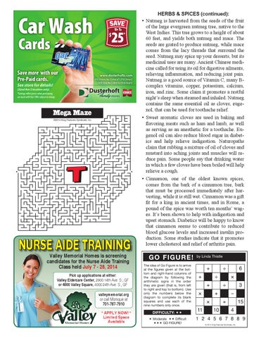 HERBS & SPICES (continued): • Nutmeg is harvested from the seeds of the fruit of the large evergreen nutmeg tree, native to the West Indies. This tree grows to a height of about 60 feet, and yields both nutmeg and mace. The seeds are grated to produce nutmeg, while mace comes from the lacy threads that surround the seed. Nutmeg may spice up your desserts, but its medicinal uses are many. Ancient Chinese medicine called for using its oil for digestive ailments, relieving inflammation, and reducing joint pain. Nutmeg is a good source of Vitamin C, many Bcomplex vitamins, copper, potassium, calcium, iron, and zinc. Some claim it promotes a restful night’s sleep when steamed and inhaled. Nutmeg contains the same essential oil as cloves, eugenol, that can be used for toothache relief. • Sweet aromatic cloves are used in baking and flavoring meats such as ham and lamb, as well as serving as an anesthetic for a toothache. Eugenol oil can also reduce blood sugar in diabetics and help relieve indigestion. Naturopaths claim that rubbing a mixture of oil of cloves and mustard into aching joints and muscles will reduce pain. Some people say that drinking water in which a few cloves have been boiled will help relieve a cough.