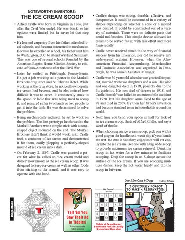 THE ICE CREAM SCOOP • Alfred Cralle was born in Virginia in 1866, just after the Civil War ended. He was black, so his options were limited but he never let that stop him. • He learned carpentry from his father, attended local schools, and became interested in mechanics. Because he excelled at school, his father sent him to Washington, D.C. to attend Wayland Seminary. This was one of several schools founded by the American Baptist Home Mission Society to educate African-Americans after the Civil War. • Later he settled in Pittsburgh, Pennsylvania. He got a job working as a porter in the Markell Brothers drug store and St. Charles Hotel. While working at the drug store, he noticed how popular ice cream had become, and he also noticed how difficult it was to serve. It consistently stuck to the spoon or ladle that was being used to scoop it, and required either two hands or two people to get it into the dish. He was determined to solve the problem. • Being mechanically inclined, he set to work on the problem. The first prototype he showed to the Markell Brothers was a simple stick with a coneshaped object mounted on the end. The Markell Brothers didn't think it would work, until Cralle took a container of ice cream and demonstrated it for them, easily plopping a perfectly-shaped mound of ice cream into a dish. • On February 2, 1897, Cralle was granted a patent for what he called an "ice cream mold and disher" now known as the ice cream scoop. It was designed to keep ice cream as well as other foods from sticking to the utensil, and it was easy to operate with one hand.