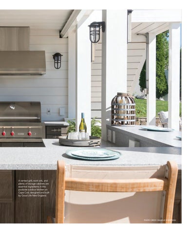A vented grill, work sink, and plenty of storage cabinets are essential ingredients in this poolside outdoor kitchen on Cape Cod, designed and built by Good Life New England.