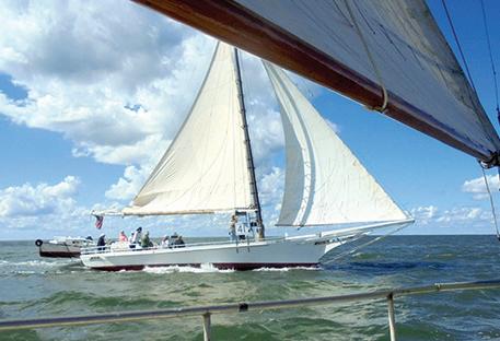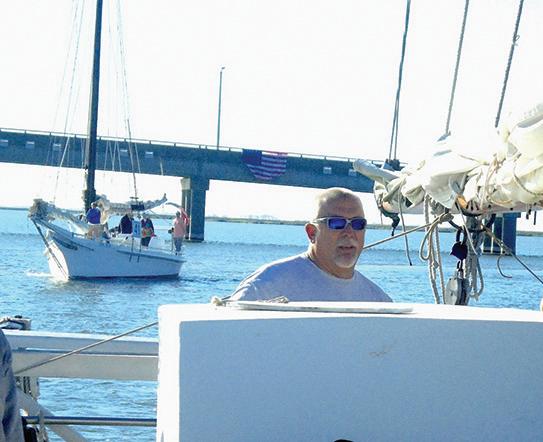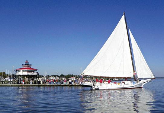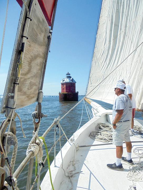 Then there was more drama. During one of our turns we cut it a little close to the bulkhead by the Choptank River lighthouse on Long Wharf at Sailwinds Park. As you can imagine, it’s not easy to change course quickly or slam on the brakes with a 47-foot-long, 50,000-pound sailboat. I am sure that we gave the spectators standing there a thrill, but fortunately the tack was suspenseful but not impactful, and we safely made the turn, thanks to Capt. Murphy III’s skillful piloting.