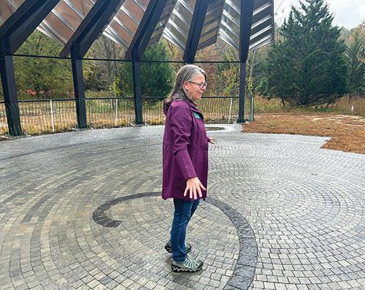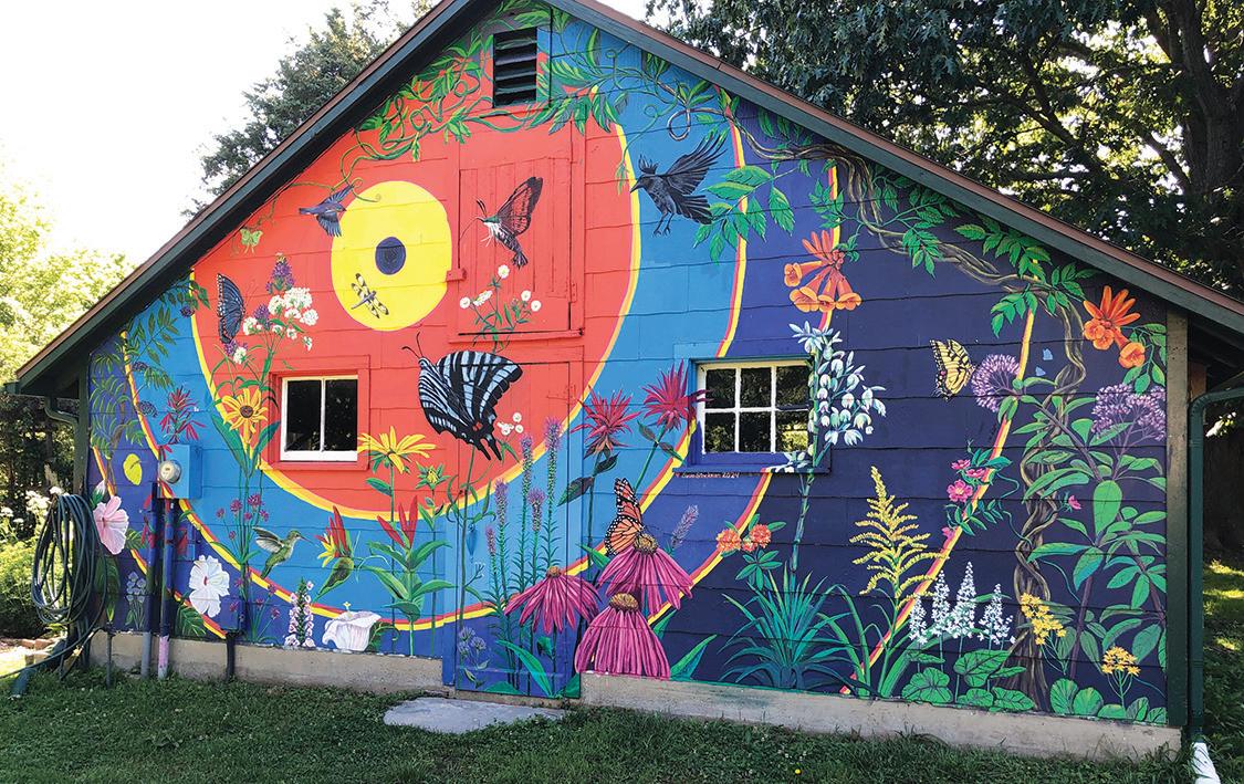 through its demonstration herb garden along its pea gravel paths under swaying tall oaks and black walnut trees tucked away near the main parking area of Pickering Creek Audubon Center. It is a space of wonder, camaraderie, learning and peacefulness. Signage identifies the herbs and gardens and a beautiful mural depicting the gardens and God’s creatures created by local artist Sue Stockman decorates the side of a building near the garden. A bench and nearby picnic tables welcome you to sit, mediate and observe.