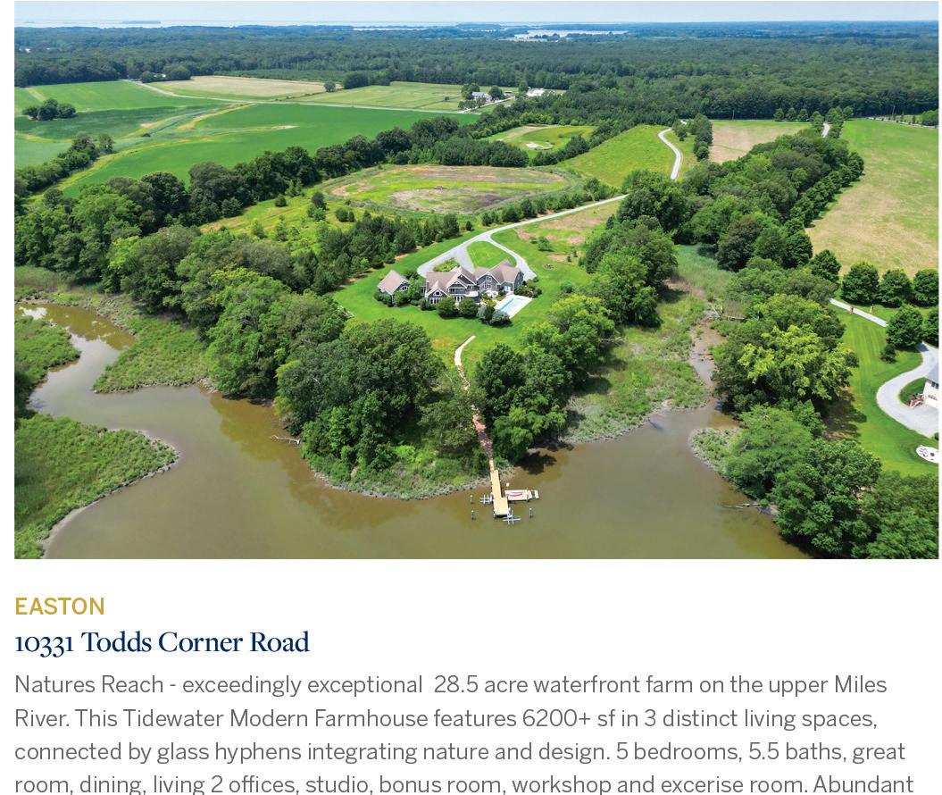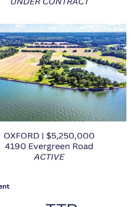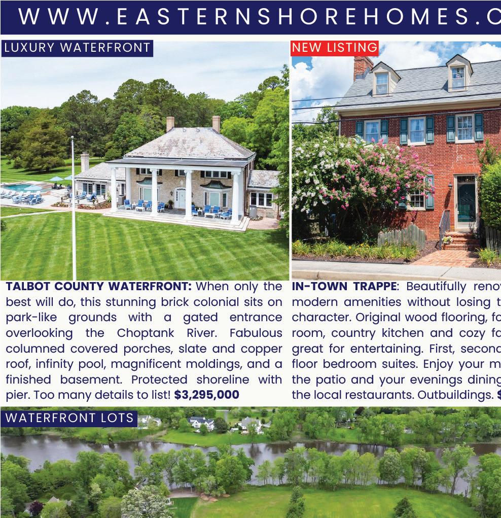 Historic Waterfront near St. Michaels on 2½ acres. Carefully preserved, this 4 BR home is perfect for full-time living or a fabulous vacation rental. Recent expansion includes a great room, owner’s suite with o ce and sitting room. Private pier and boat ramp, detached workshop and studio apt. $1,199,000
