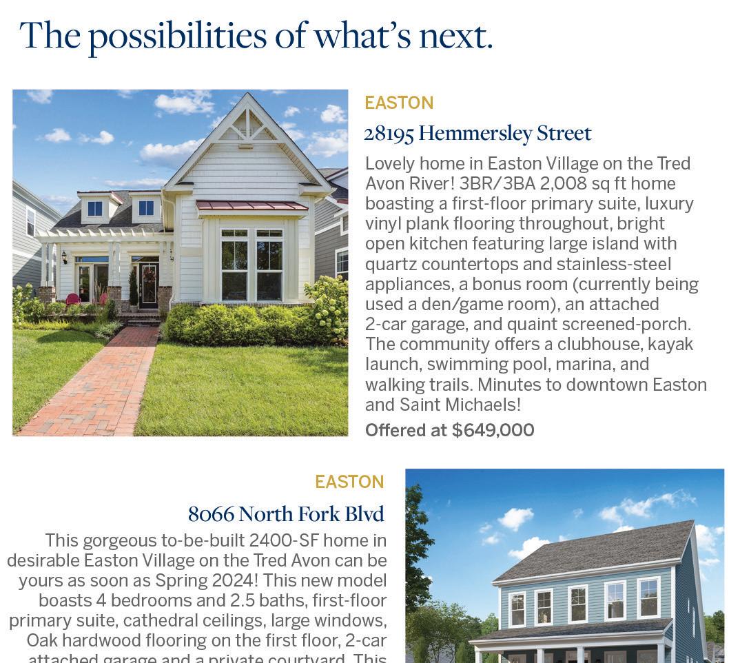 EASTON VILLAGE - New construction - never occupied. Brookfield Harrington model features a living room/dining combination, family room with gas fireplace open to gourmet kitchen, 1st floor primary suite plus guest bedroom and bath. 2nd floor offers large loft area and 2 guest bedrooms and bath. Luxury plank vinyl flooring throughout. Walk-in attic storage. Rear patio. Community clubhouse, pool, exercise paths, kayak launch and fishing pier. Close to downtown Easton and short drive to St. Michaels and Oxford on the Tred Avon River. $750,000