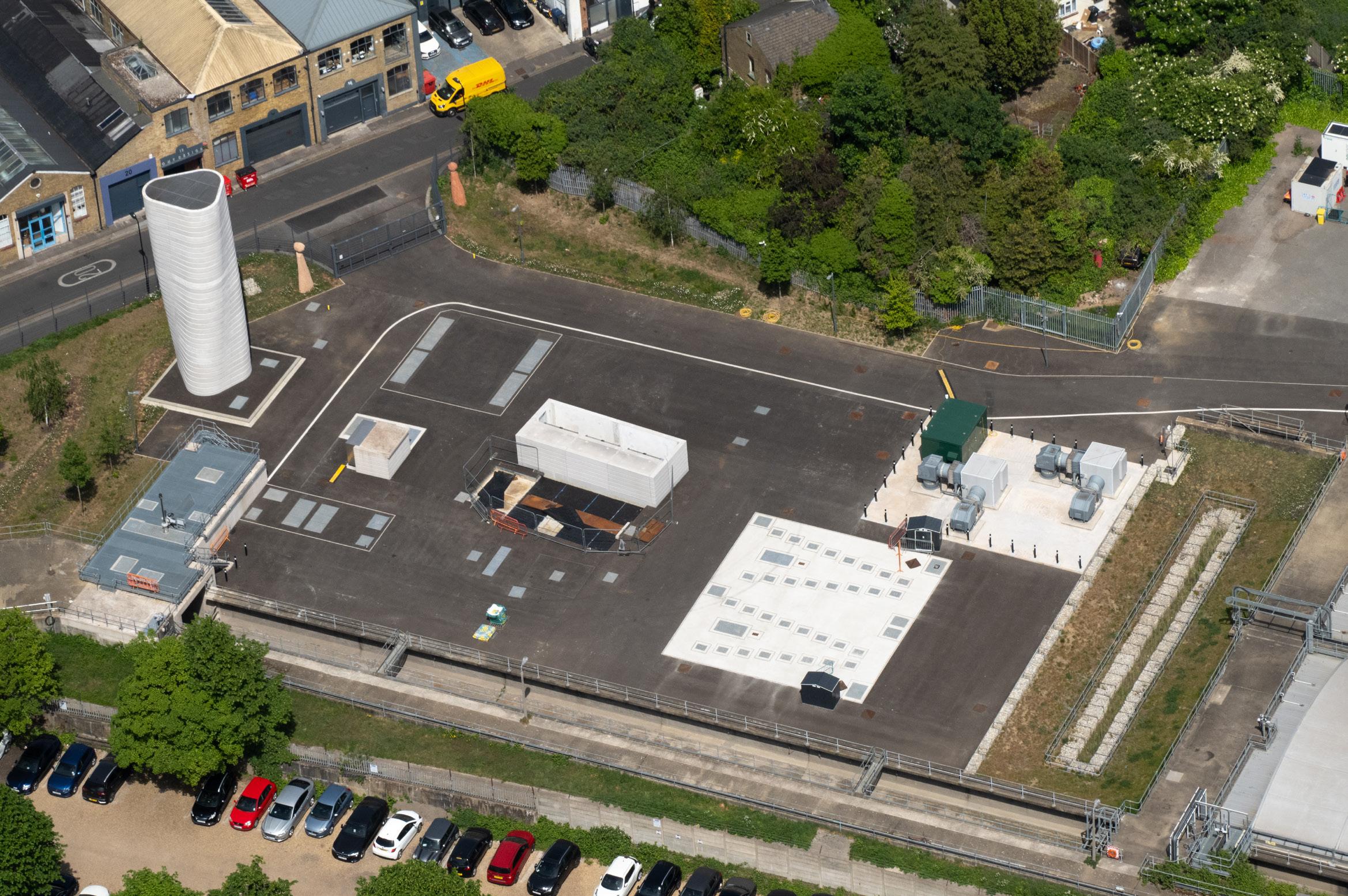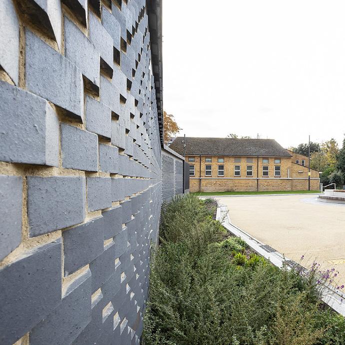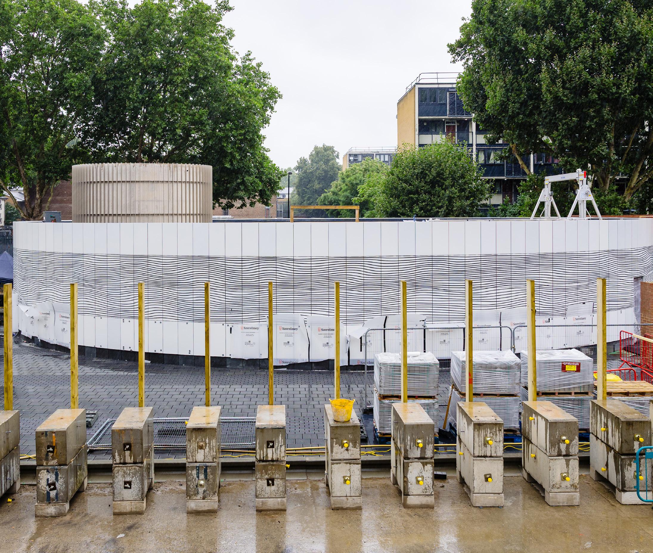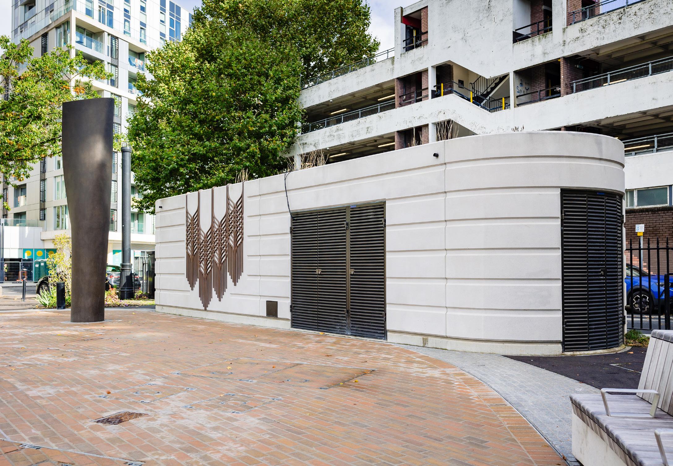 The space integrates artwork by Yemi Awosile. As well as featuring this artwork on its facades, the site’s permanent operational building has a 22.5m2 brown/ biodiverse roof. The bronze ventilation column features a bespoke poem by Dorothea Smartt referencing the River Wandle.