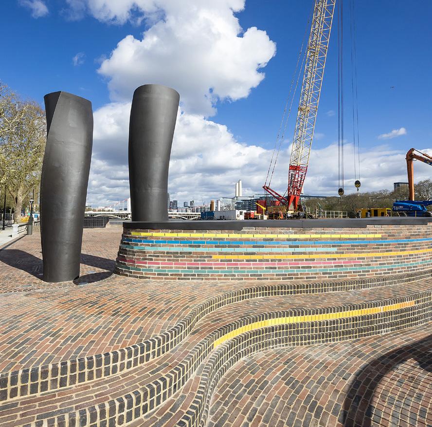 The design of the space was based on a ‘flowing bands’ motif, which is a visual reference to the currents in the river bend and nearby reeds. These bands can be seen in the ventilation column, operational kiosk building and the wall to Hurlingham Wharf.