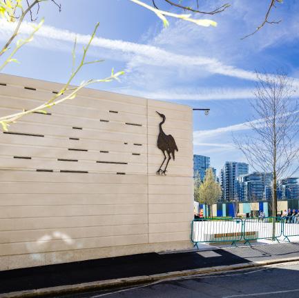 Sarah Staton was commissioned by Tideway to create two cast bronze sculptures for the space. The artwork is titled ‘Standing Heron’ and ‘Heron in Flight’