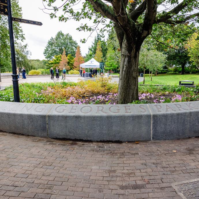 A large Red Oak tree, surrounded by a new natural granite low wall with bronze inlaid lettering, is the main visual marker of the new entrance. The slightly elevated space maximises the view to the south over the ornamental lake to the rest of the park.