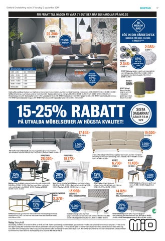 Skarphällsg. 4. 0498-21 34 76. Mån-fre 10-18. Lör 10-16. Sön 11-16. *Gäller nybeställning av soffor/fåtöljer, ej specialpriser. **Gäller även satsbord, hörnbord och lampbord. ***Har du inte fått någon katalog eller värdecheck? Kom till butik, bli medlem och nyttja erbjudandet. ****Erbjudandet gäller på ordinarie priser på Dream Delux, Sense Delux och Sleep Delux i tyg Lova. Gäller även samtliga gavlar valbara i tyg Lova. Erbjudandena gäller så långt lagret räcker, dock längst t.o.m. 16/9 och kan ej kombineras med andra erbjudanden. Lokala avvikelser kan förekomma. Reservation för slutförsäljning och ev. tryckfel. Mer info på mio.se