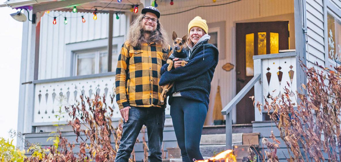Erik och Matilda med hunden Maya framför huset i Soukolojärvi som de hyrde. Foto: Erik Wernerlich
