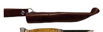 Skärkniv med handtag av renhorn/bok, 8,5 cm knivblad i kolstål och en djurmönstrad slida. Knivens totala längd är 19,5 cm.