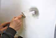 8. Har man en plan lagningsyta kan man börja med att skrapa bort det yttersta lagret. Använd en vass målarskrapa, bara i själva skadan och dra den lite på snedden ut mot det oskadade området.