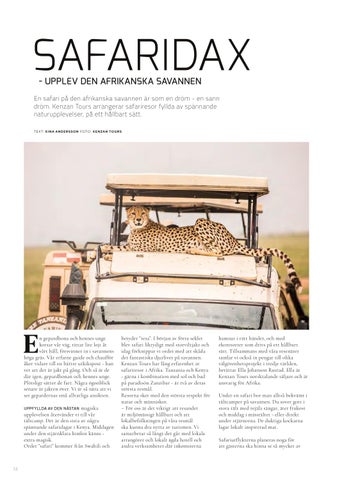 betyder ”resa”. I början av förra seklet blev safari liktydigt med storviltjakt och idag förknippar vi ordet med att skåda det fantastiska djurlivet på savannen. Kenzan Tours har lång erfarenhet av safariresor i Afrika. Tanzania och Kenya - gärna i kombination med sol och bad på paradisön Zanzibar - är två av deras största resmål. Resorna sker med den största respekt för natur och människor. – För oss är det viktigt att resandet är miljömässigt hållbart och att lokalbefolkningen på våra resmål ska kunna dra nytta av turismen. Vi samarbetar så långt det går med lokala arrangörer och lokalt ägda hotell och andra verksamheter där inkomsterna
